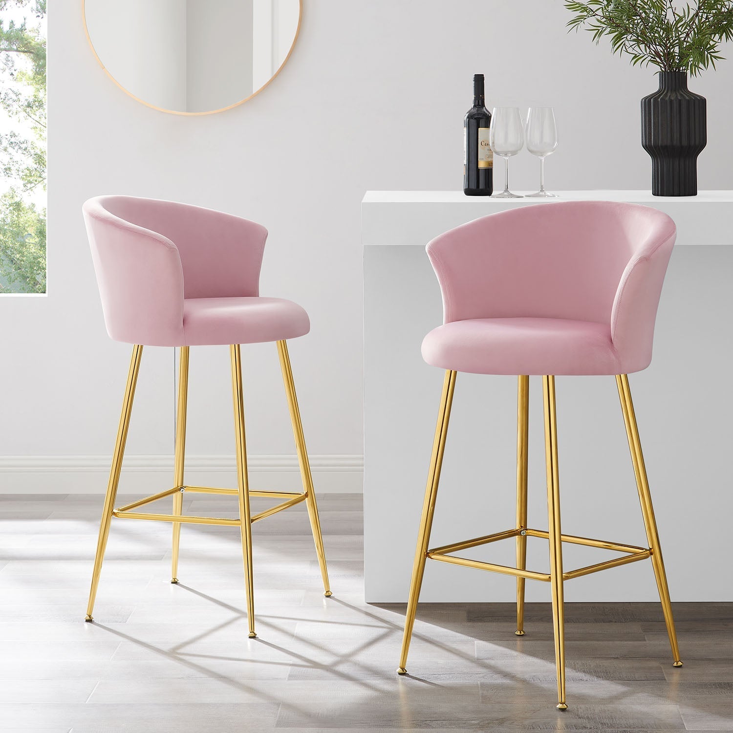 Nos tabourets de bar en velours Kylie sont dotés d'un revêtement en velours doux et moelleux de couleur rose pastel.