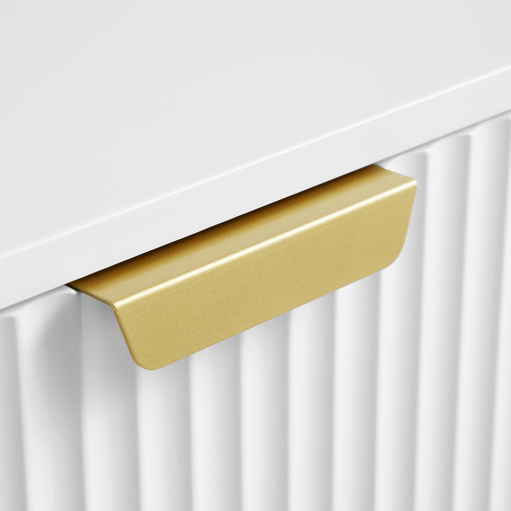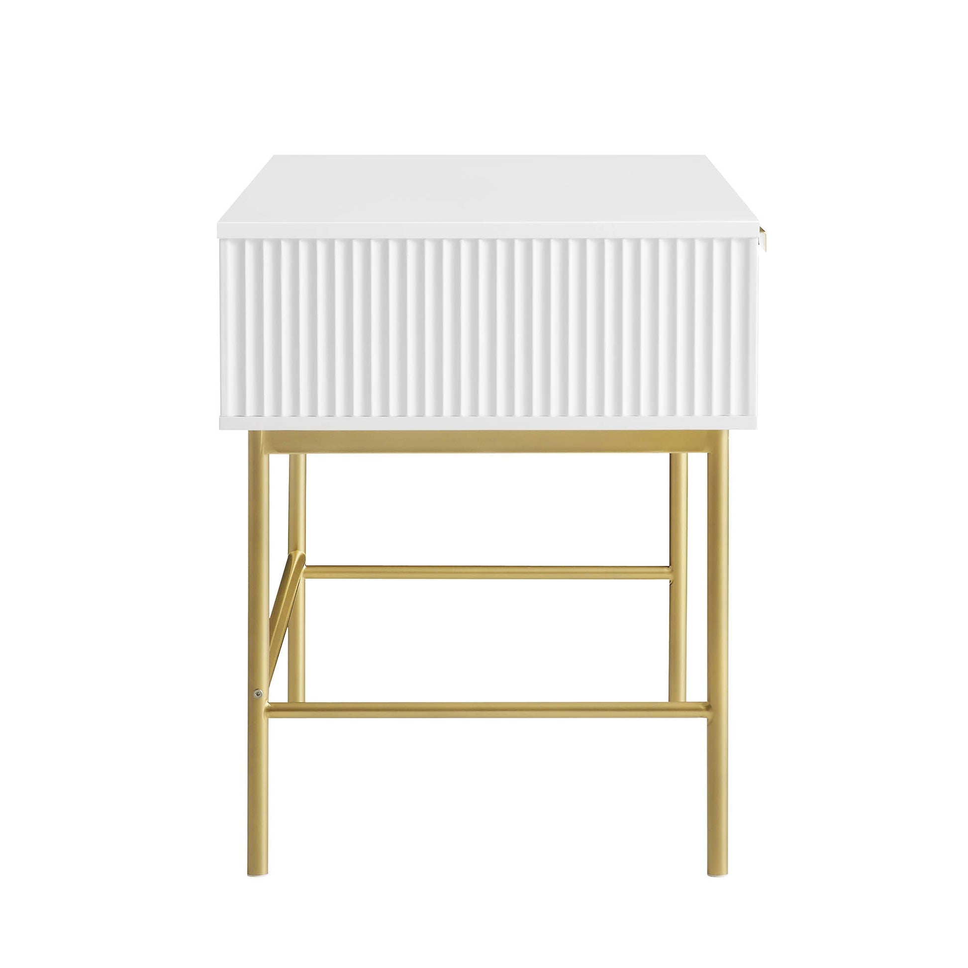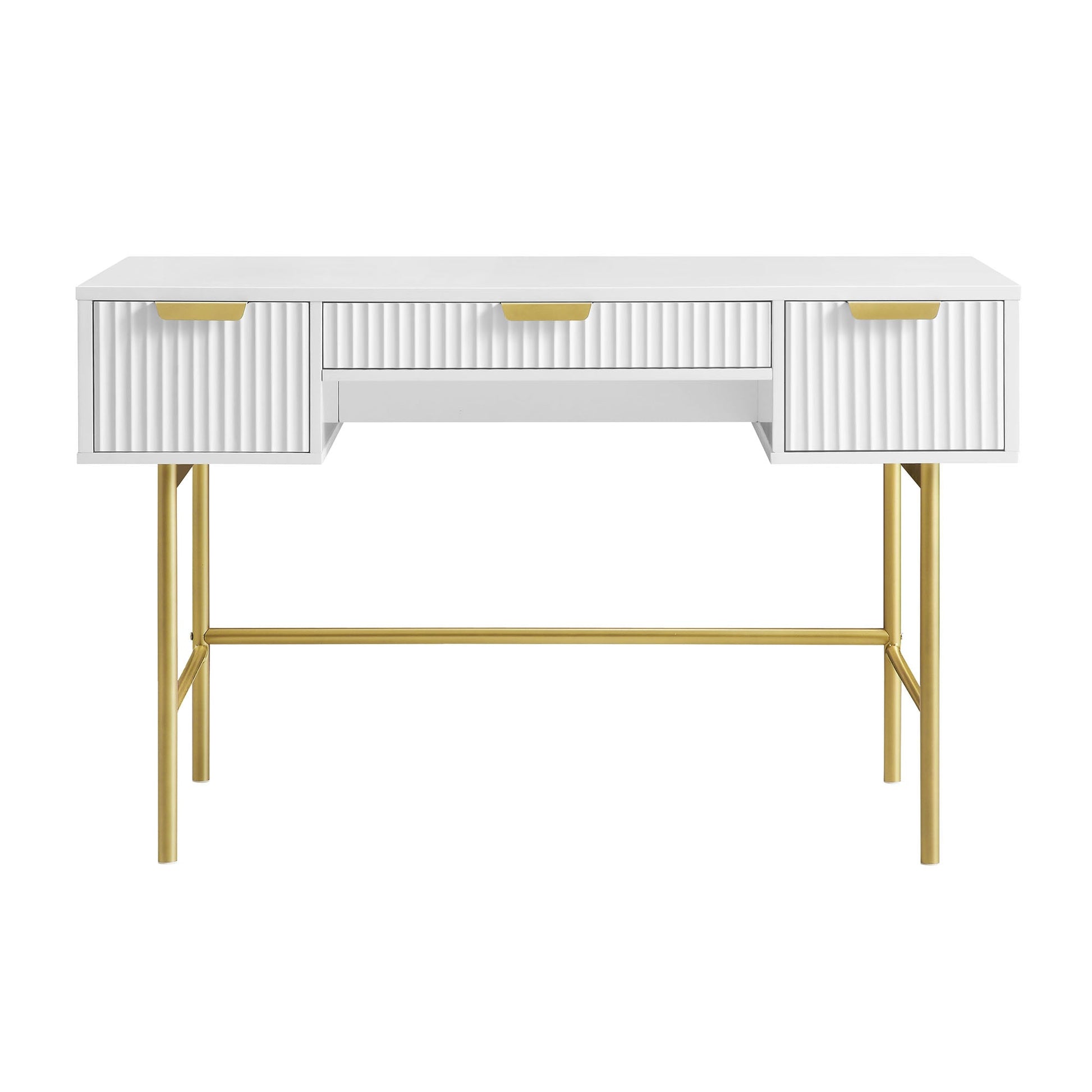 La coiffeuse comprend 3 tiroirs avec une façade striée finie en peinture blanche mate, accentuée de poignées et de pieds dorés.
