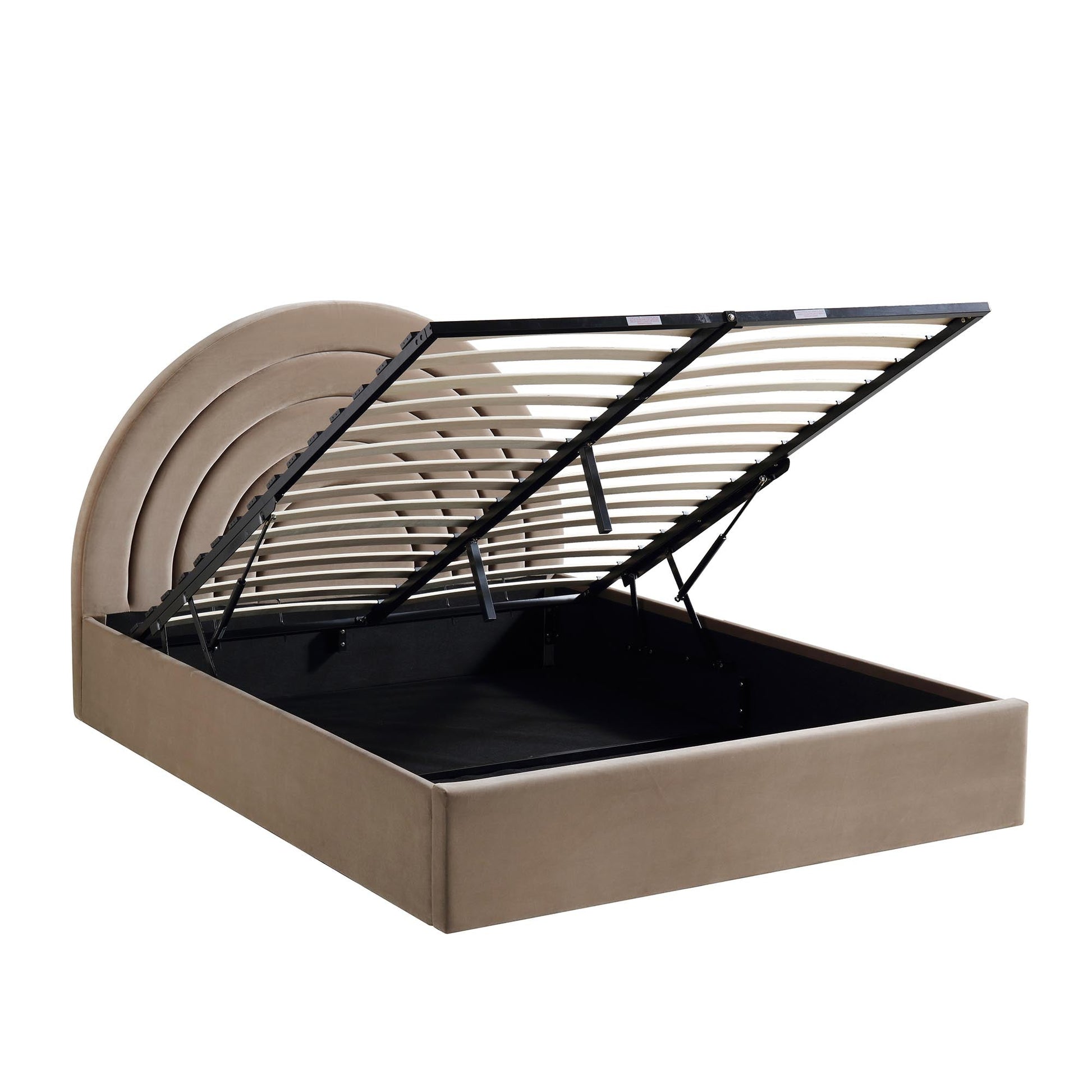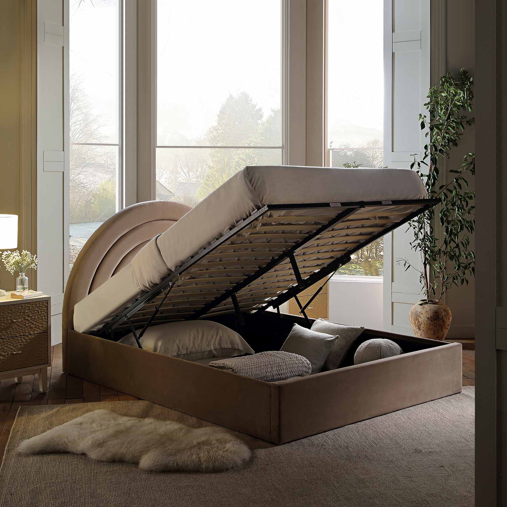 Le lit Archer est doté d'une tête de lit cannelée en forme d'arc-en-ciel arquée et d'un espace de rangement fonctionnel sous le lit.