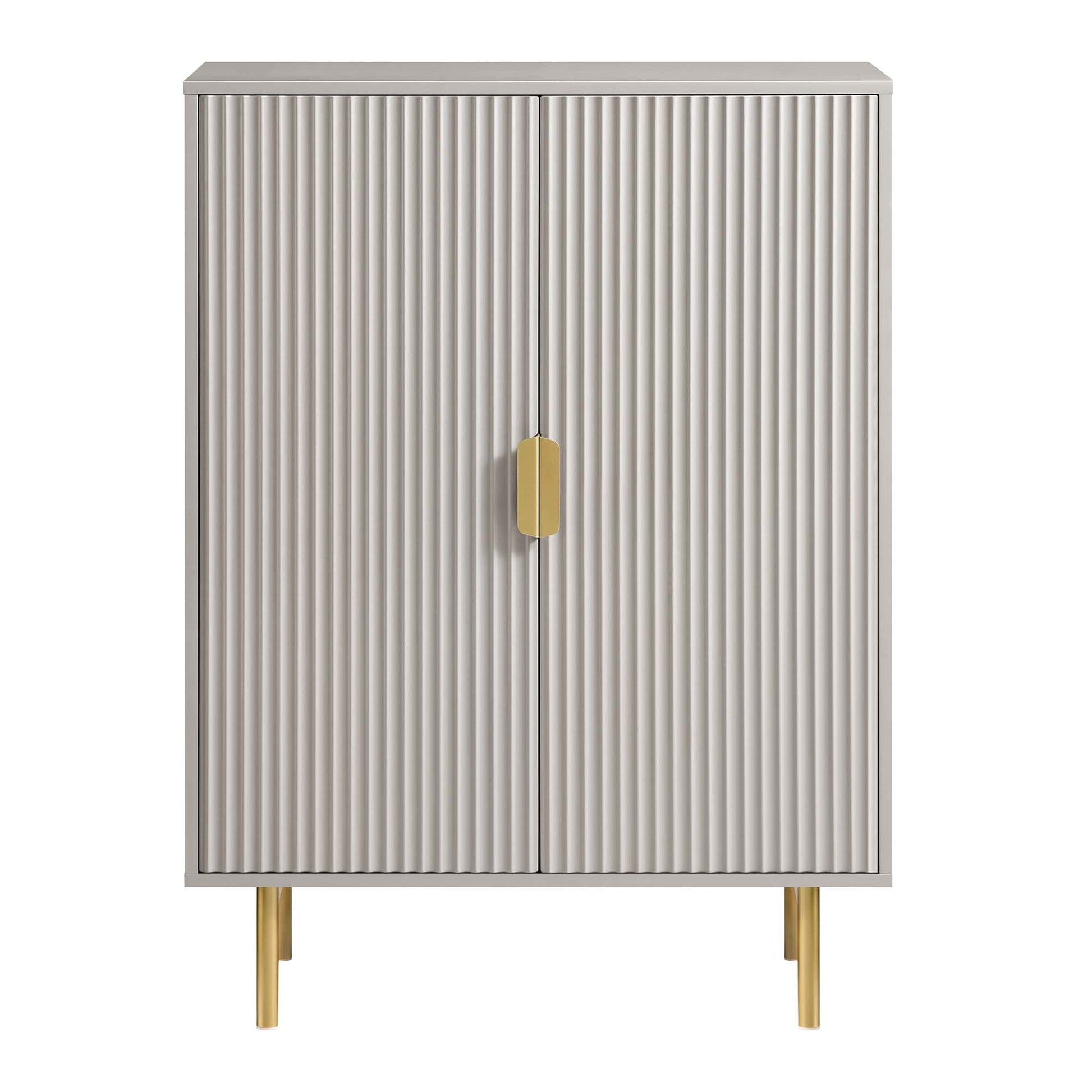 • L'armoire présente une surface de porte striée finie en peinture taupe mate, associée à des poignées et des pieds dorés.
