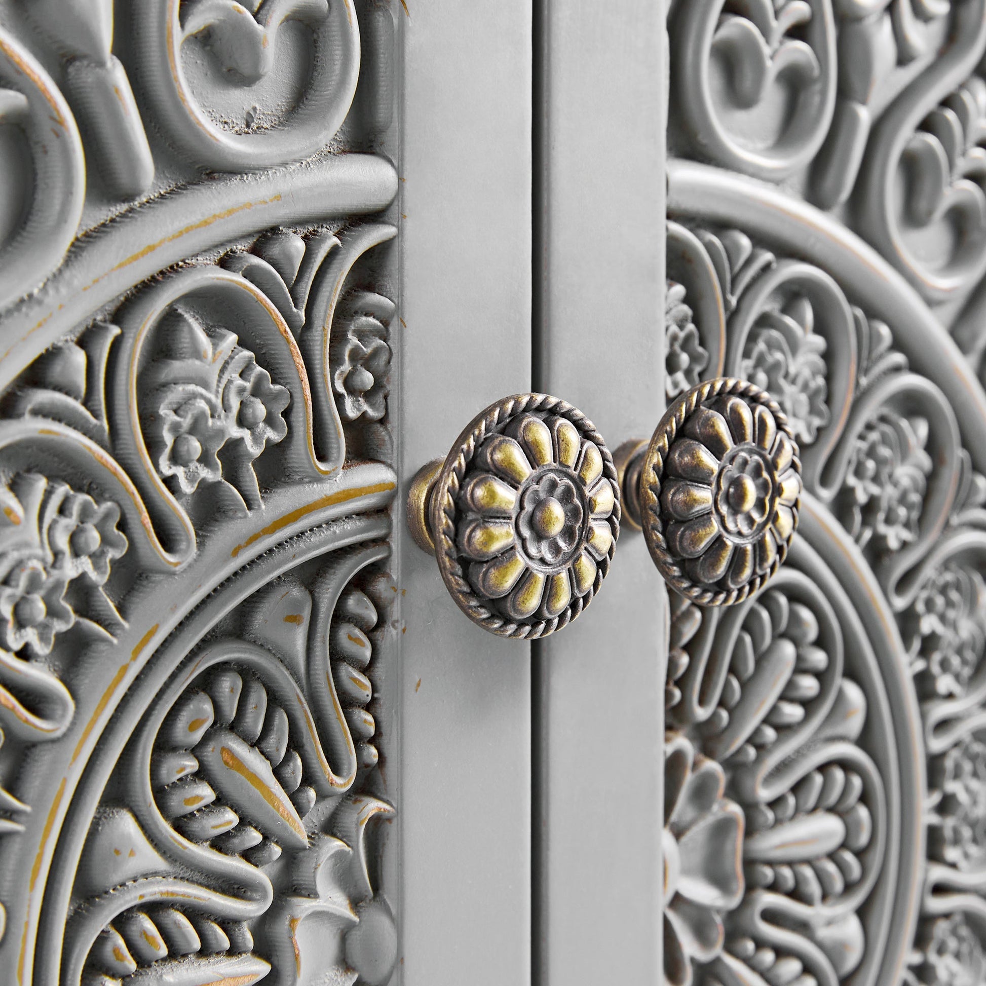 Fini dans une peinture gris moyen, ce meuble-lavabo comprend des portes doubles avec des panneaux avant sculptés et des boutons de style ancien.