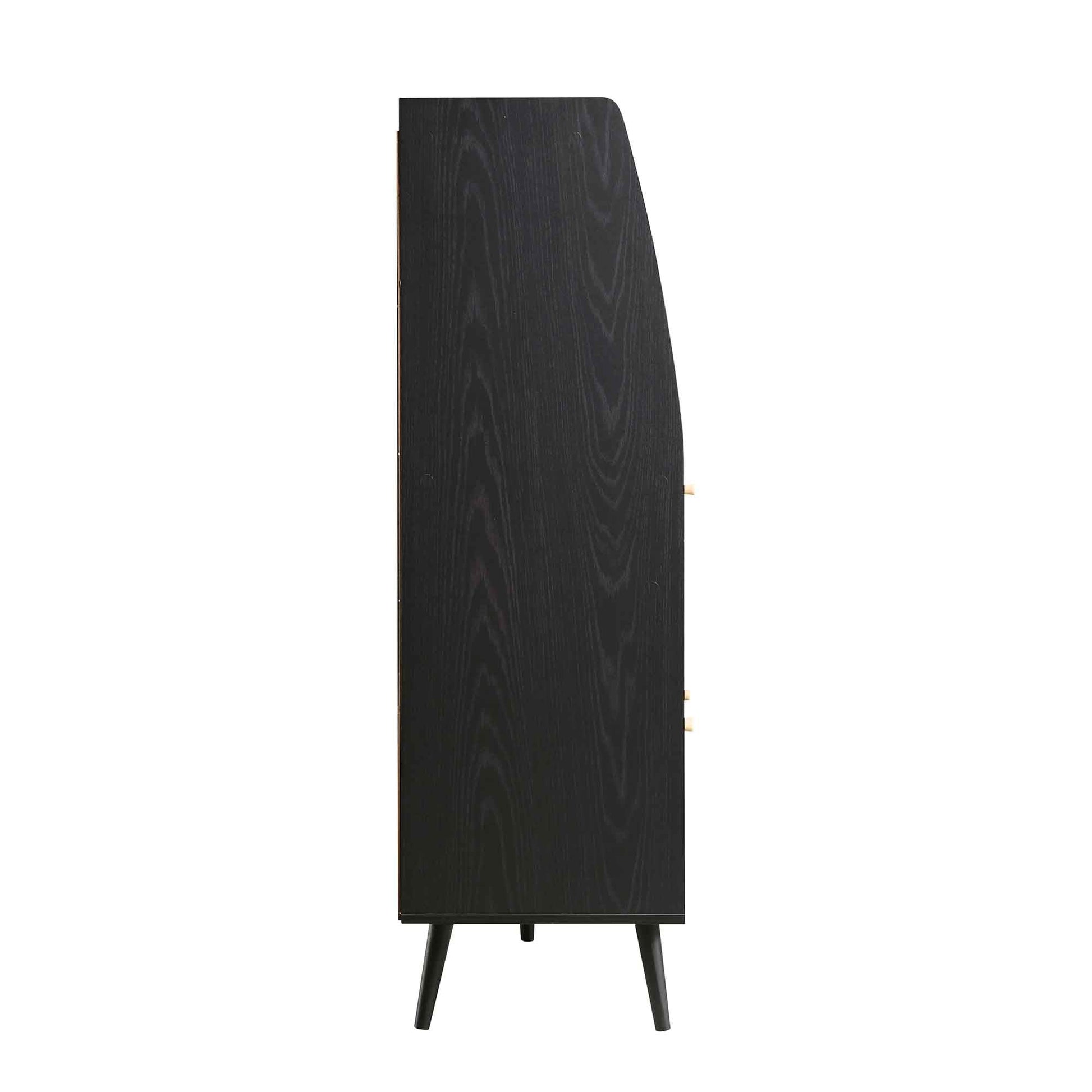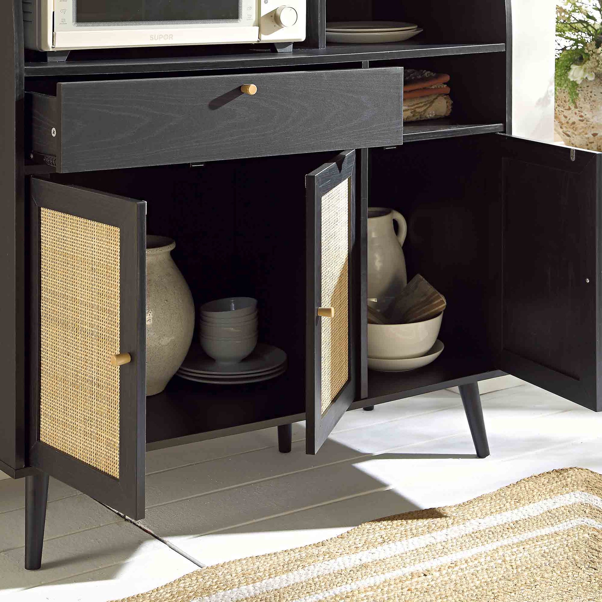 Doté d'étagères à plusieurs niveaux, idéales pour exposer verres et petits électroménagers, ce meuble de cuisine Frances, très fonctionnel, est également doté d'un tiroir et d'un espace de rangement fermé. Les façades de portes en rotin naturel tressé à la main s'harmonisent parfaitement avec les poignées en bois massif.