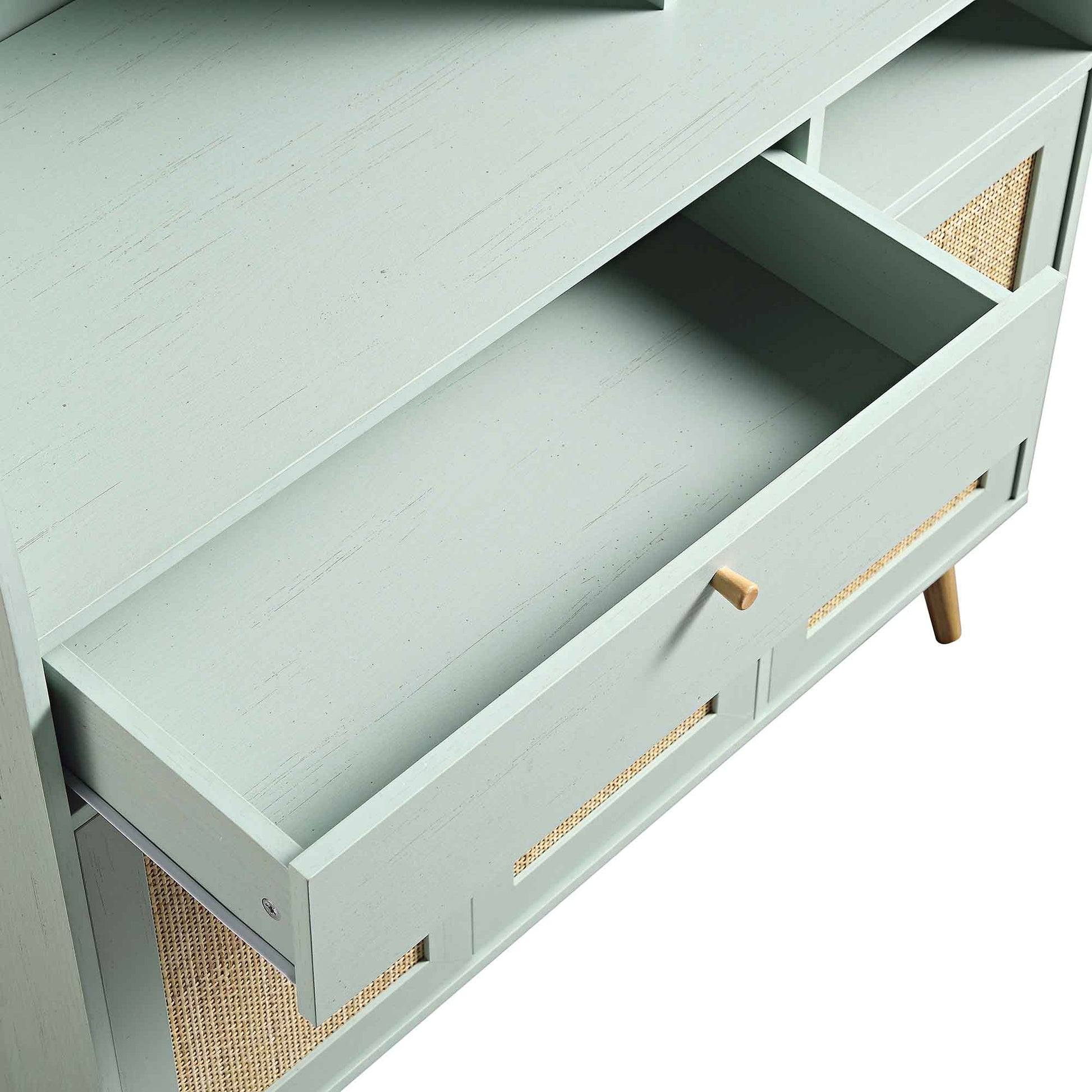 Doté d'étagères à plusieurs niveaux, idéales pour exposer verres et petits électroménagers, ce meuble de cuisine Frances, très fonctionnel, est également doté d'un tiroir et d'un espace de rangement fermé. Les façades de portes en rotin naturel tressé à la main s'harmonisent parfaitement avec les poignées en bois massif.