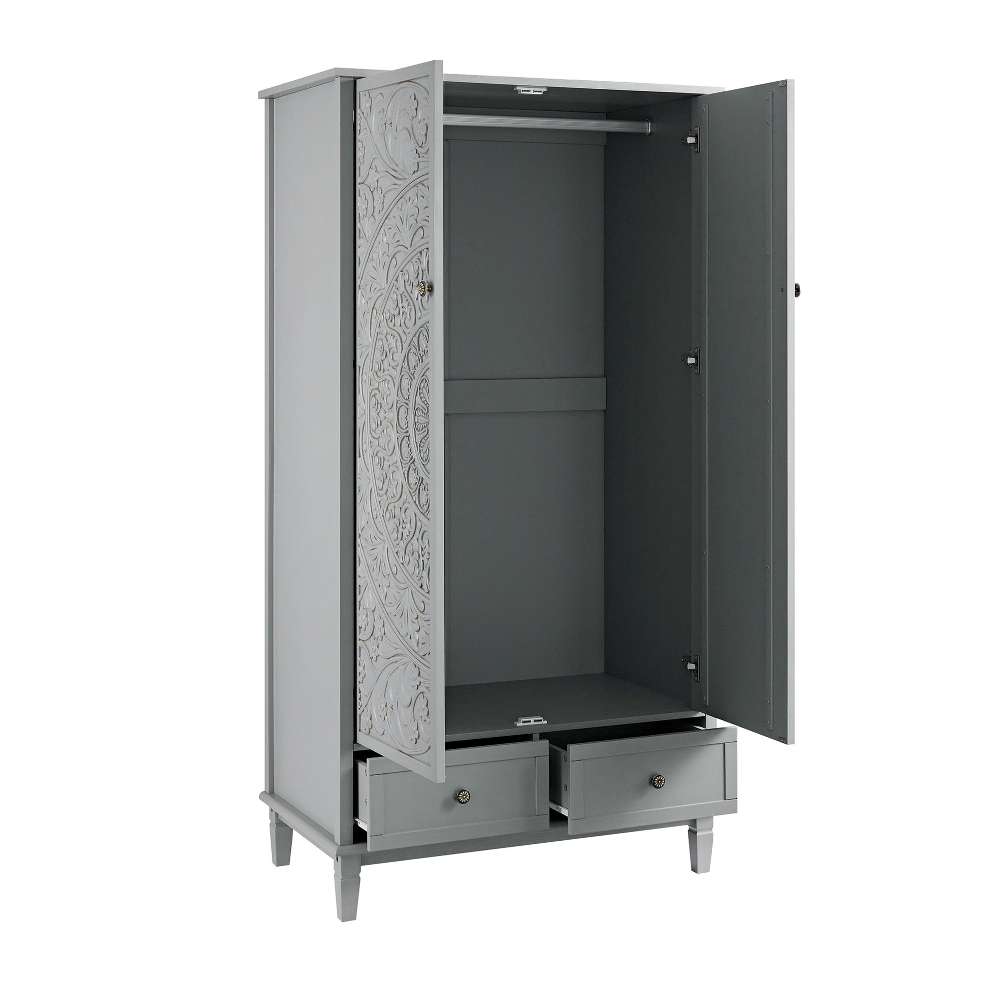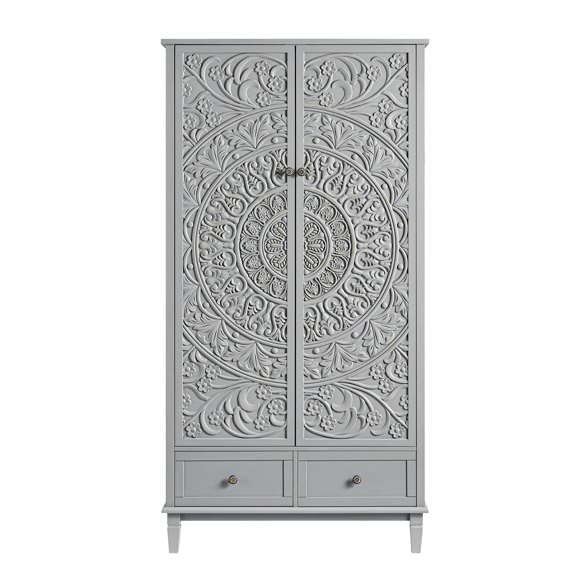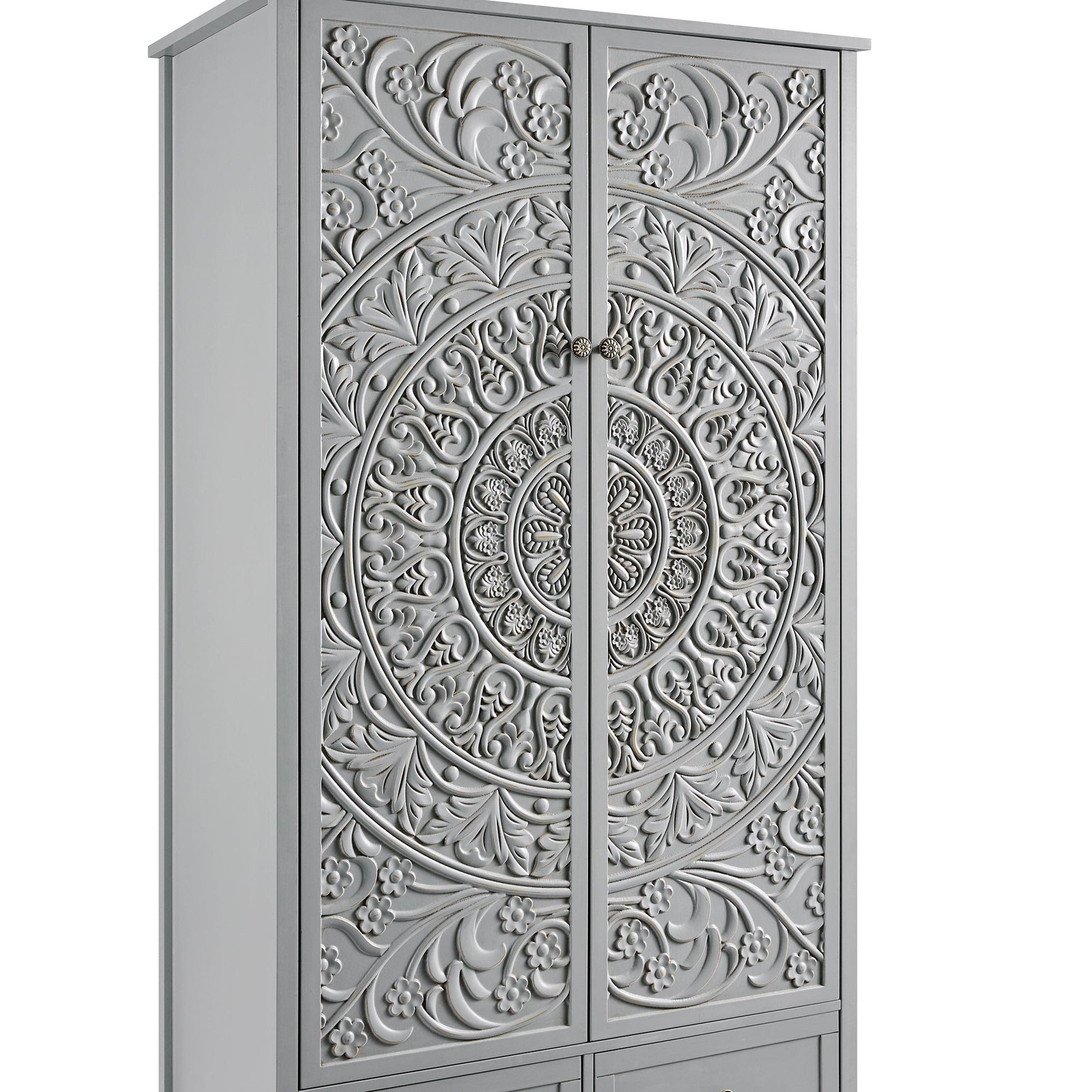 Les portes doubles sont ornées de motifs floraux sculptés, équilibrés par la silhouette épurée et classique de l'armoire.