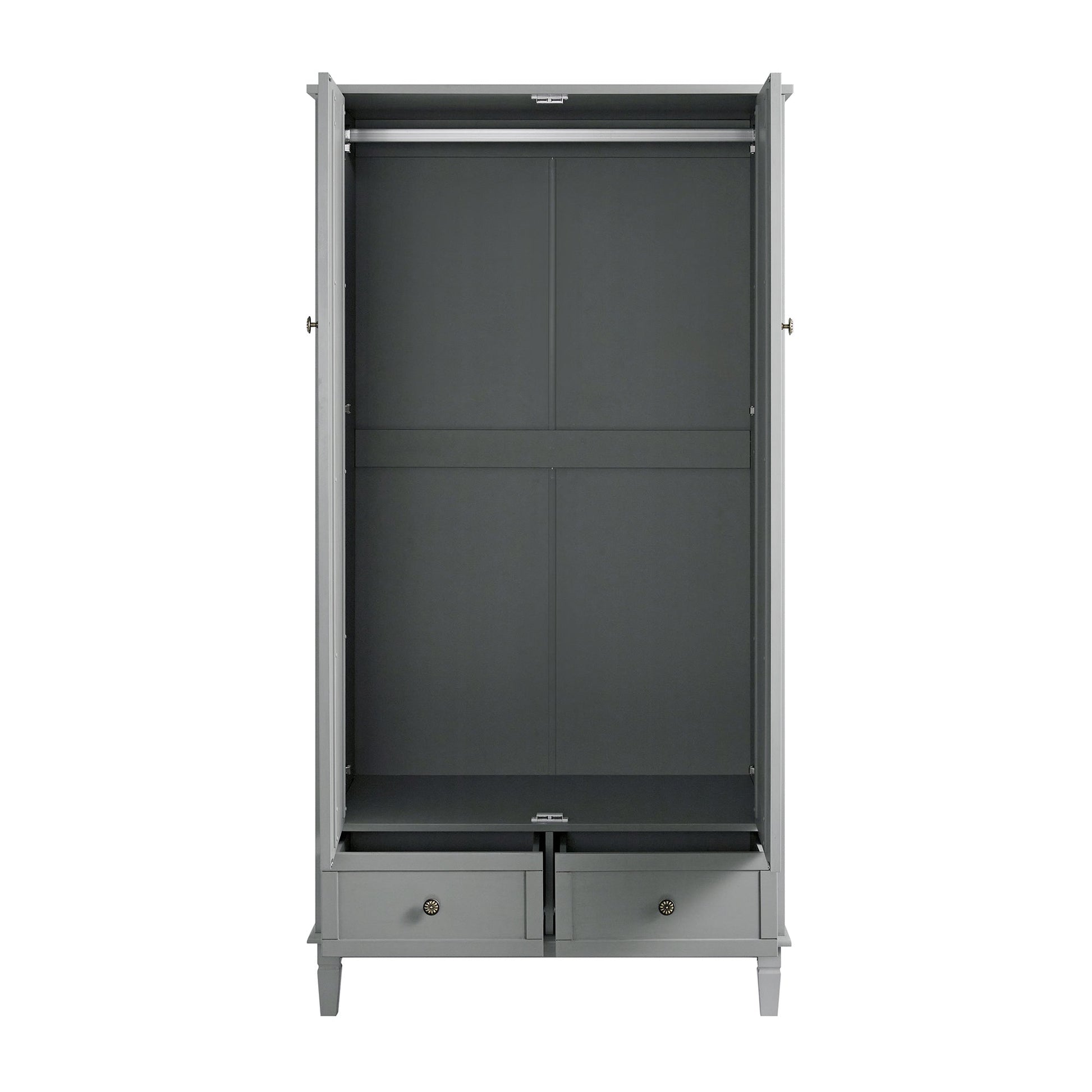 À l'intérieur, une tringle de suspension offre un rangement vertical pour les vêtements plus longs, tandis que deux tiroirs inférieurs offrent une organisation pratique pour les petits objets essentiels.