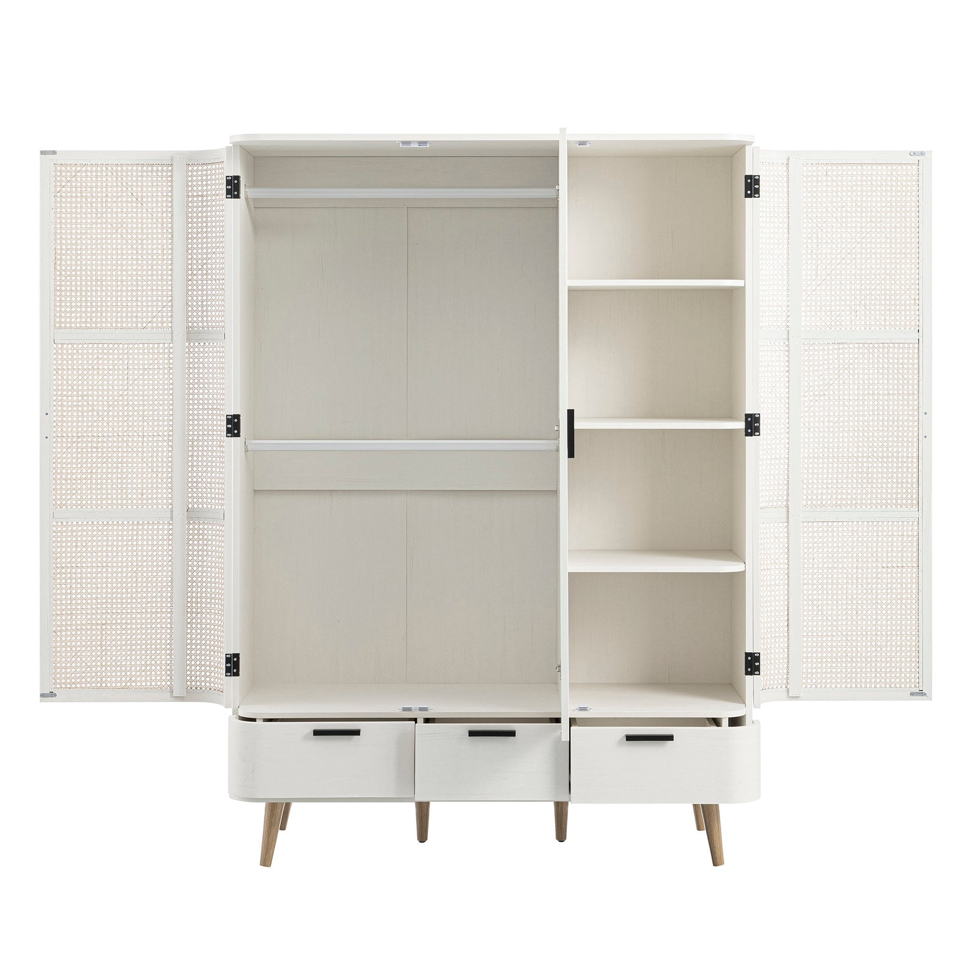 Léger, aéré et plein de caractère, le placard triple en rotin incurvé Izzy en blanc apporte une sophistication décontractée à votre chambre.