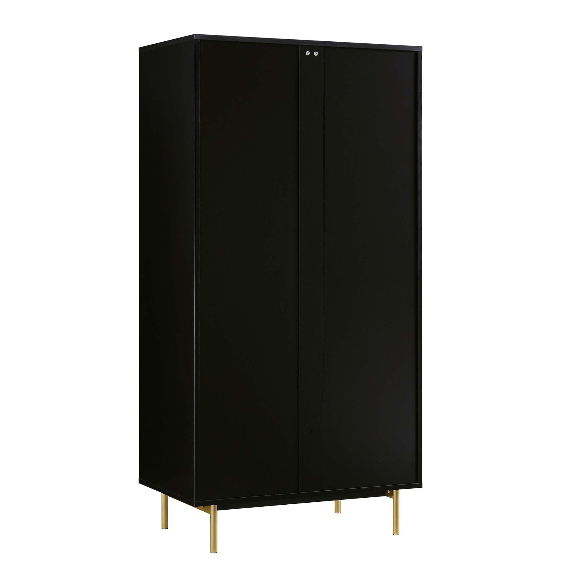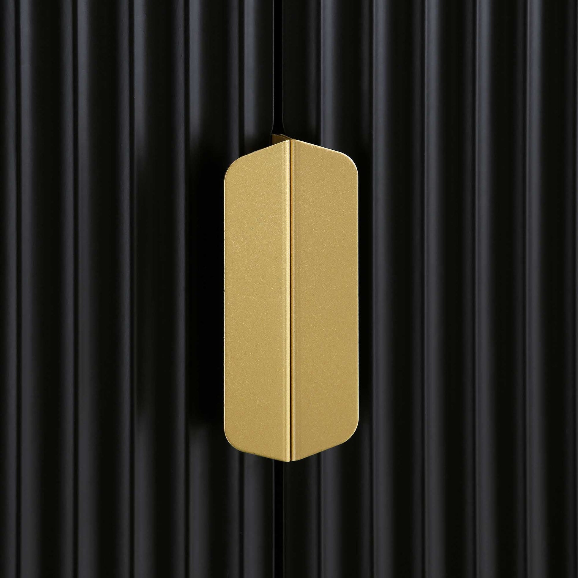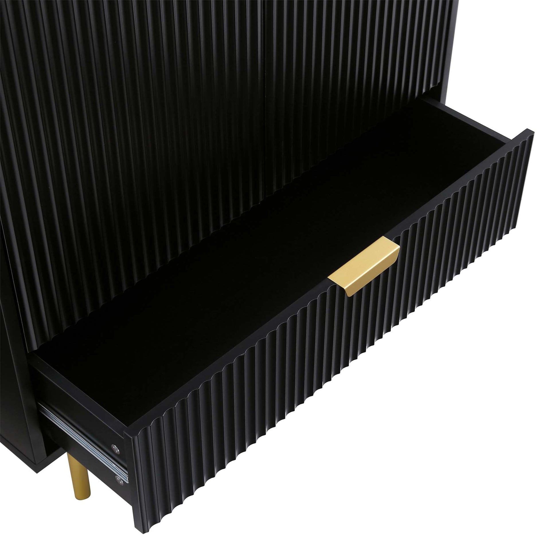 • Le placard est doté de portes striées élégantes et d'une façade de tiroir finie en peinture noire mate, associée à des poignées et des pieds dorés.