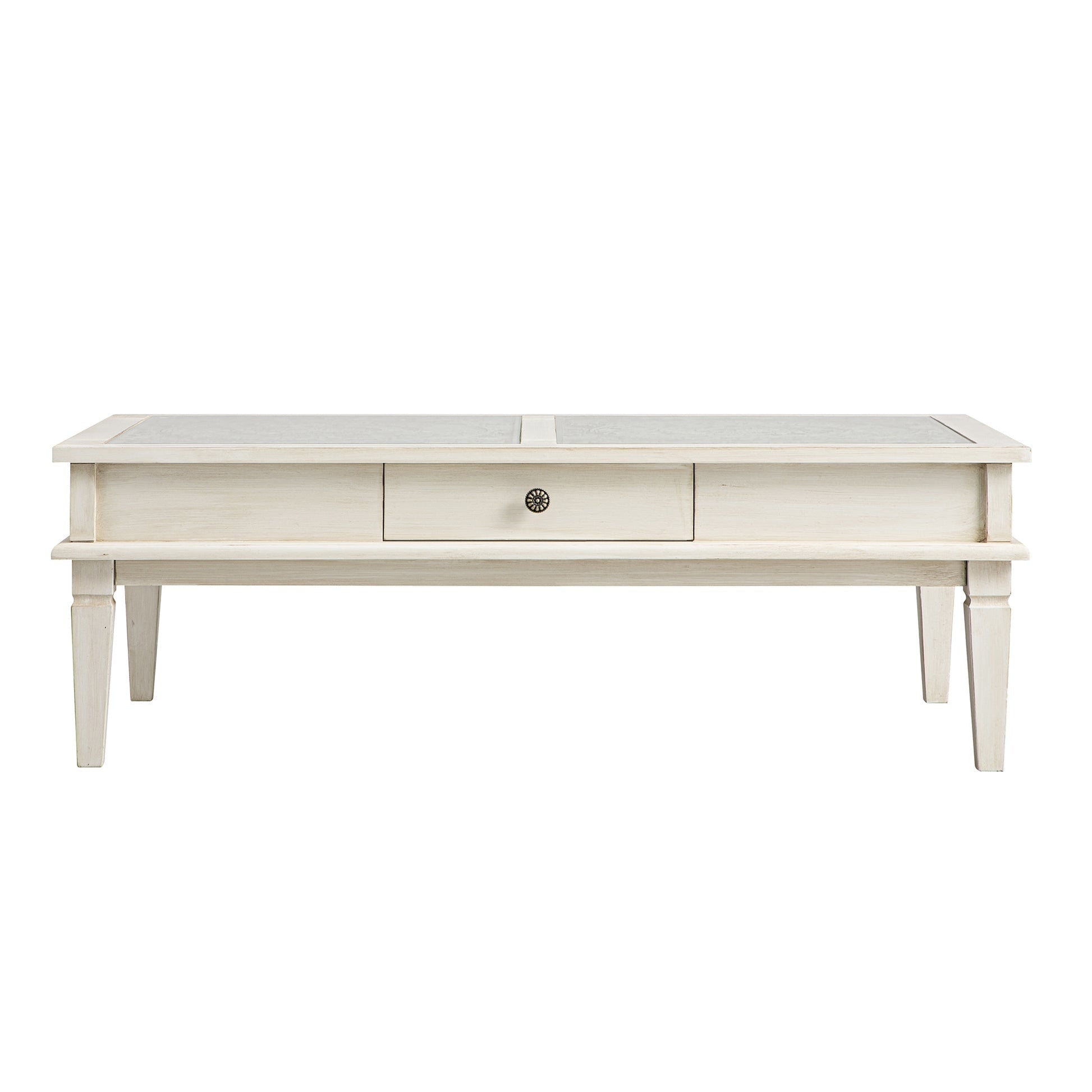 Avec ses surfaces en bois blanchies à la chaux et son plateau sculpté à motifs floraux, notre table basse Chantilly sera un point focal pratique et magnifique dans votre salon.