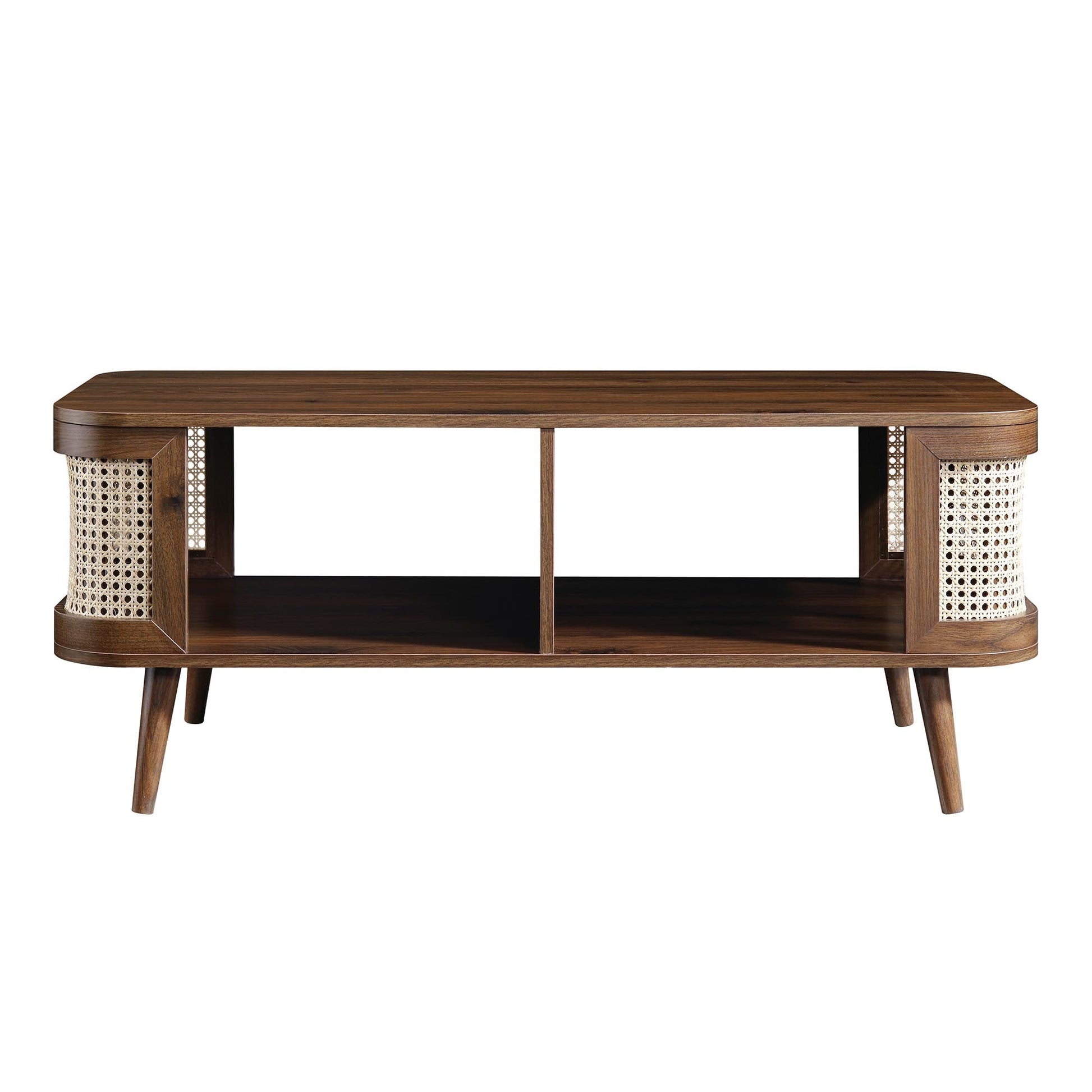 Le rotin naturel tissé à la main se coordonne avec des pieds en bois massif, avec une finition effet noyer pour un look milieu du siècle.