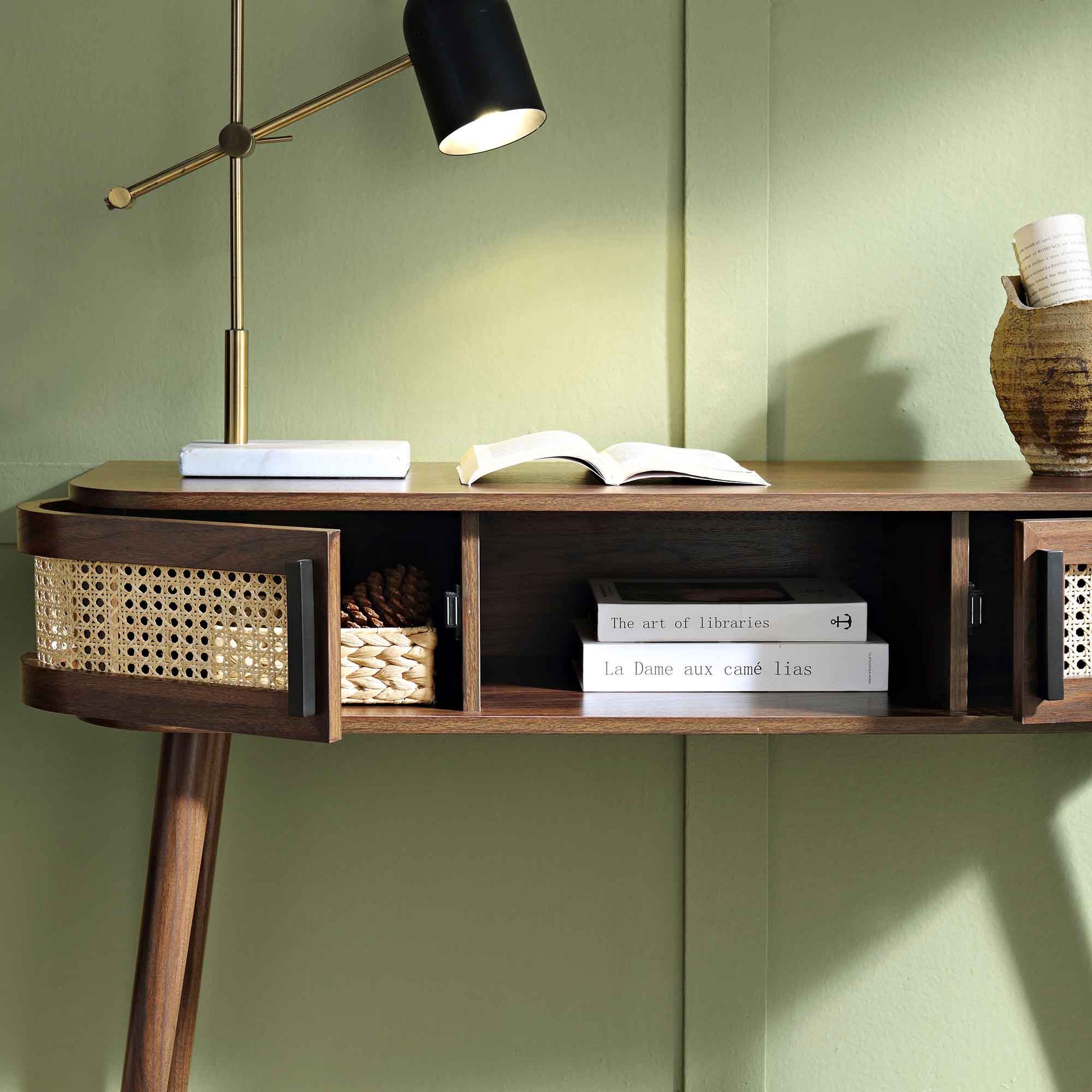 Table Izzy courbée en rotin à 2 portes, noyer