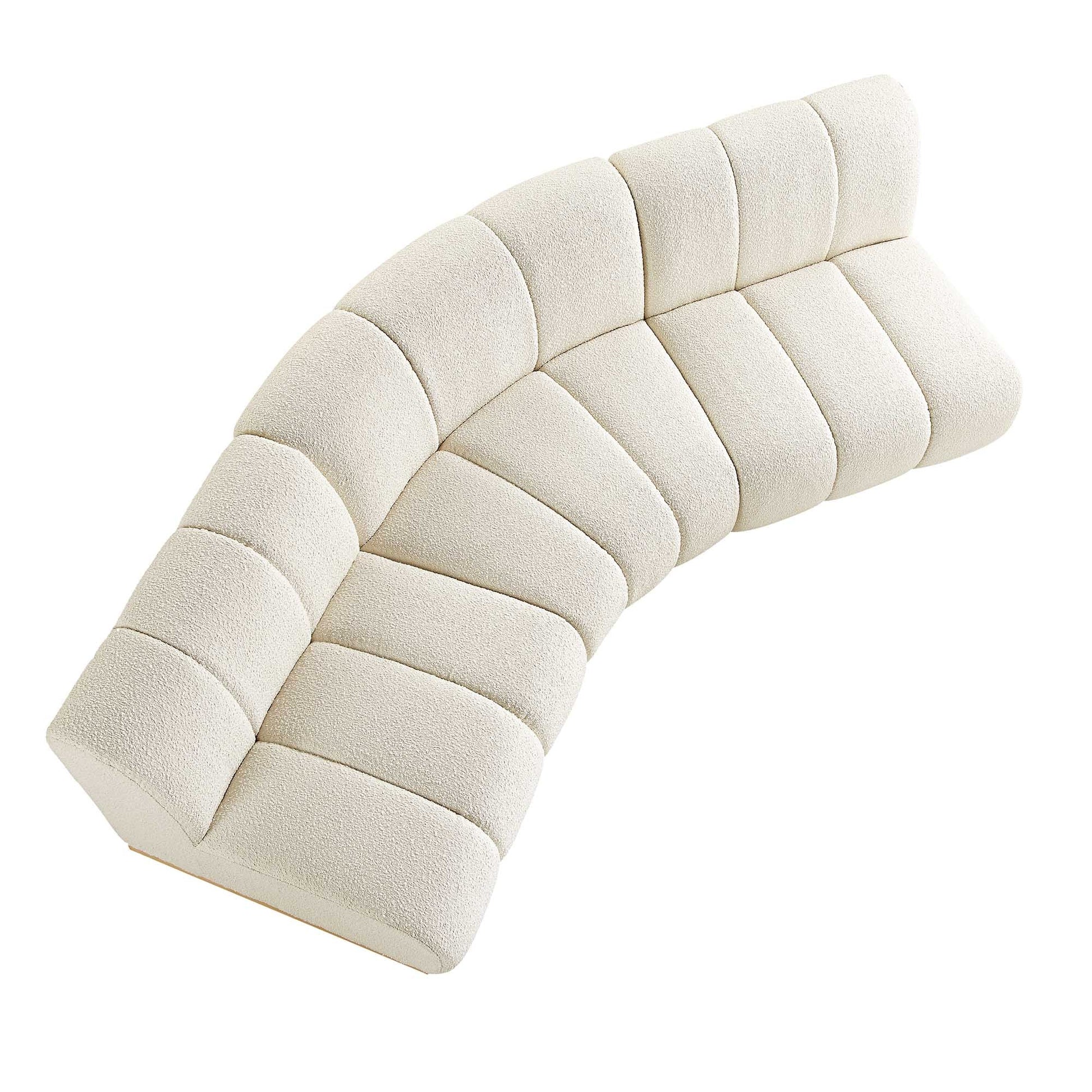 Recouvertes d'un magnifique tissu bouclé écru, les sections du canapé sont montées sur des bases en bois massif naturel.