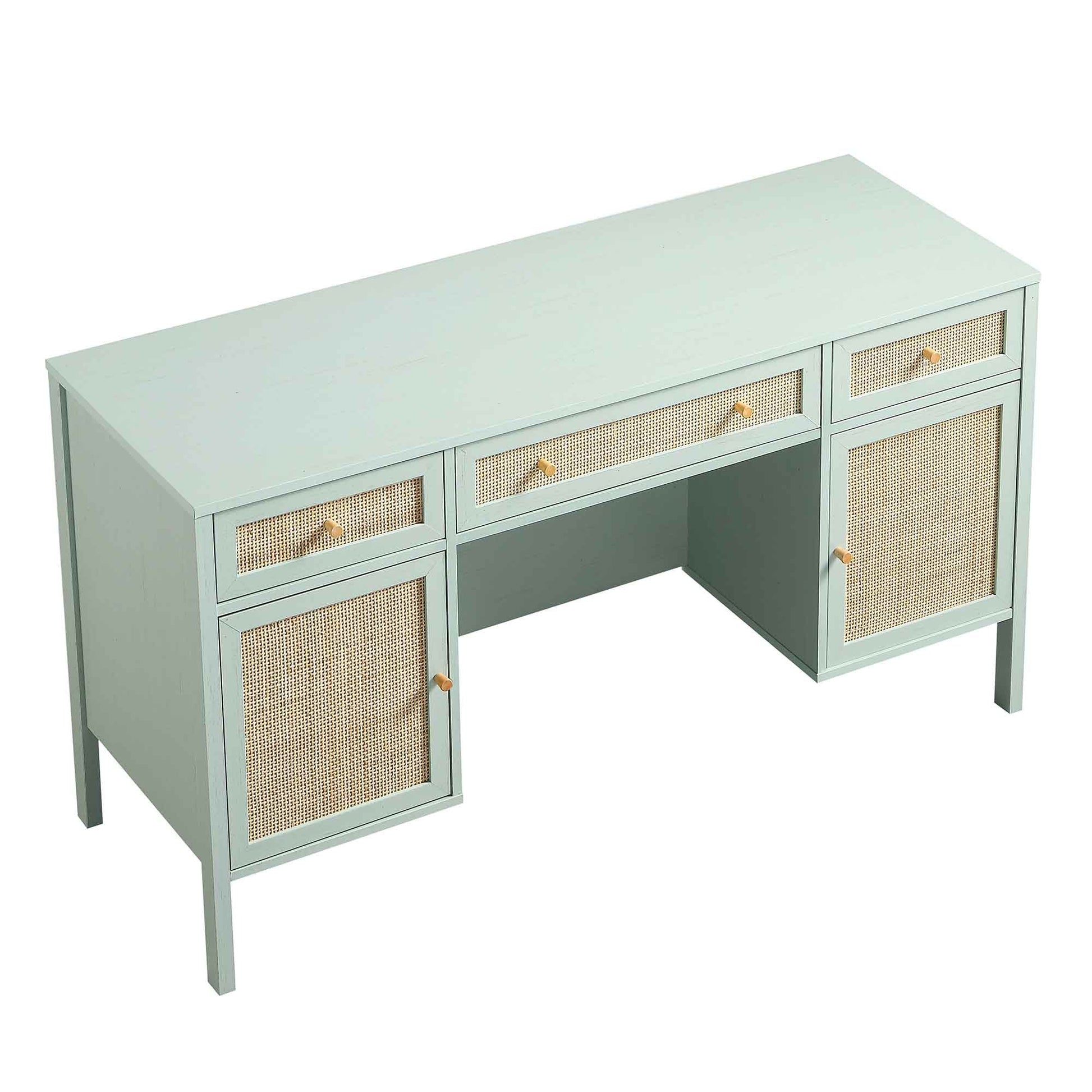 Les inserts en rotin naturel tissé à la main sur les portes des tiroirs des placards se coordonnent avec la poignée et les pieds en bois massif.