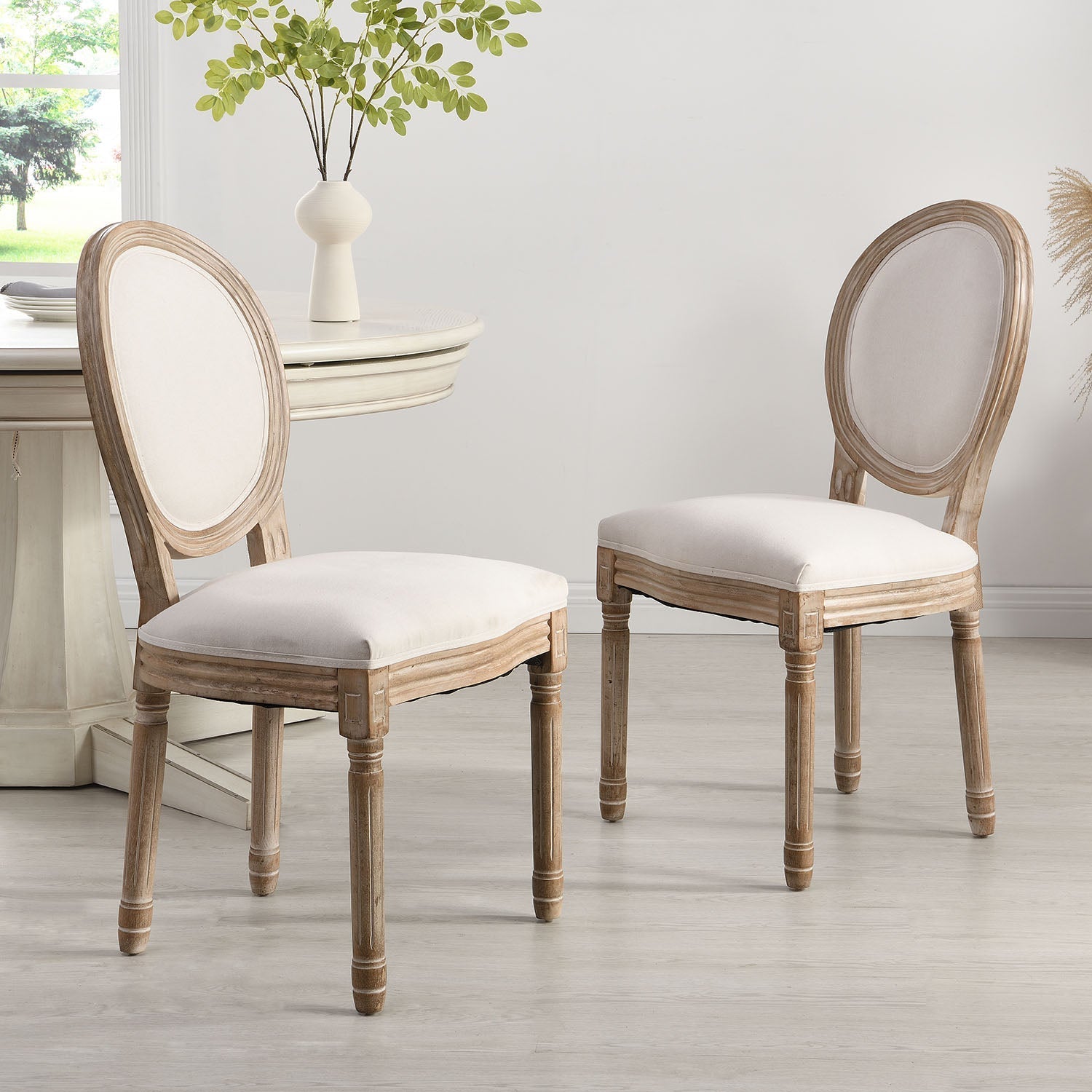 Fabriquée en bois massif, la structure de la chaise a été subtilement blanchie à la chaux pour un look rustique élégant.
