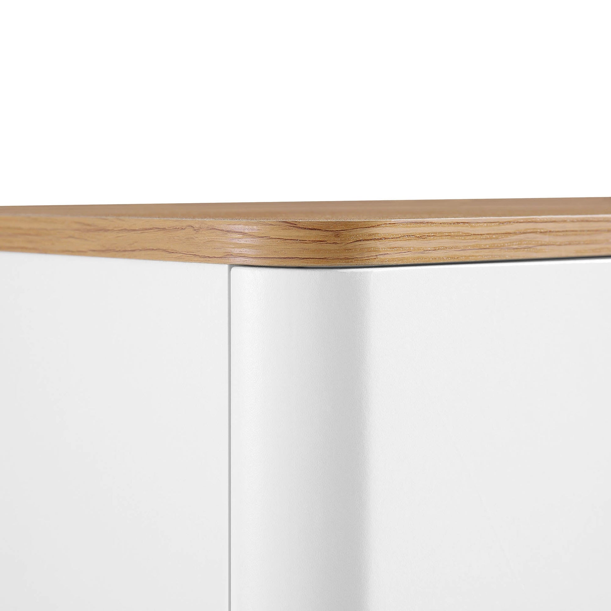 Les bords incurvés sont coordonnés avec une finition peinte mate blanc cassé et un plateau en chêne.