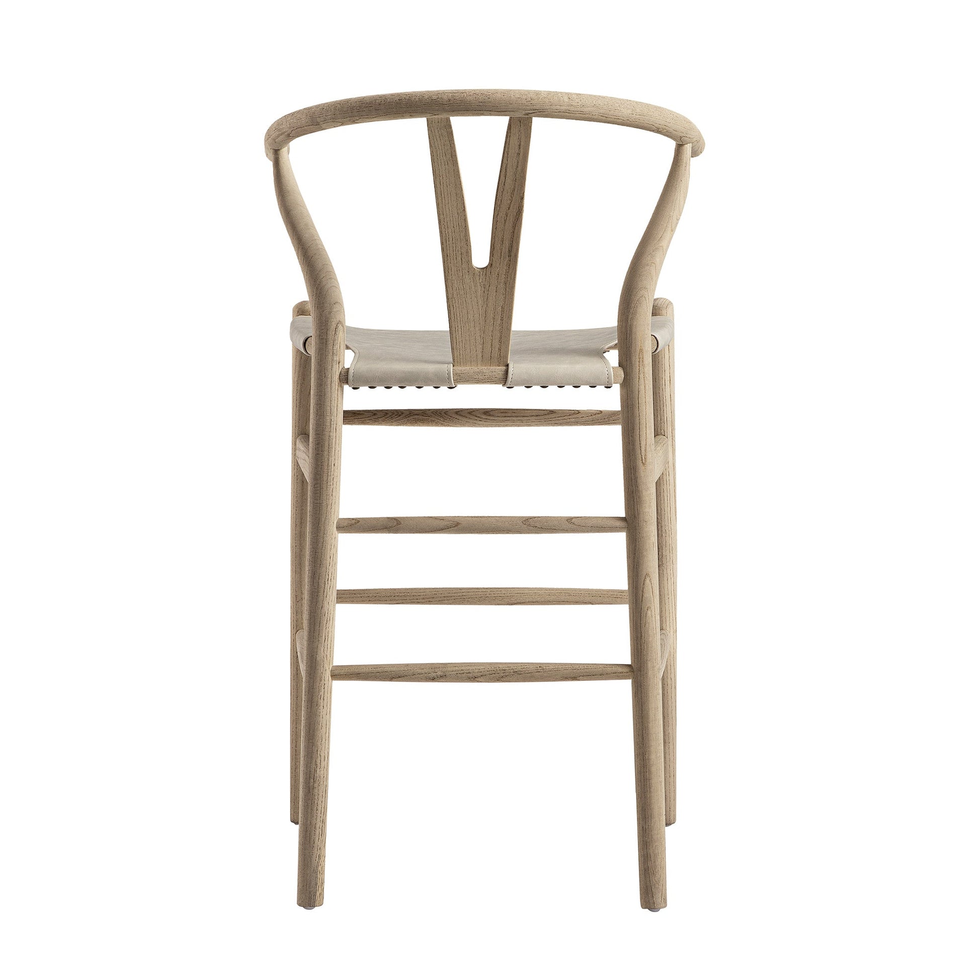 Dotée d'un dossier en Y, la chaise est solidement fabriquée en orme massif dans une élégante finition patinée, coordonnée au siège en similicuir gris clair.