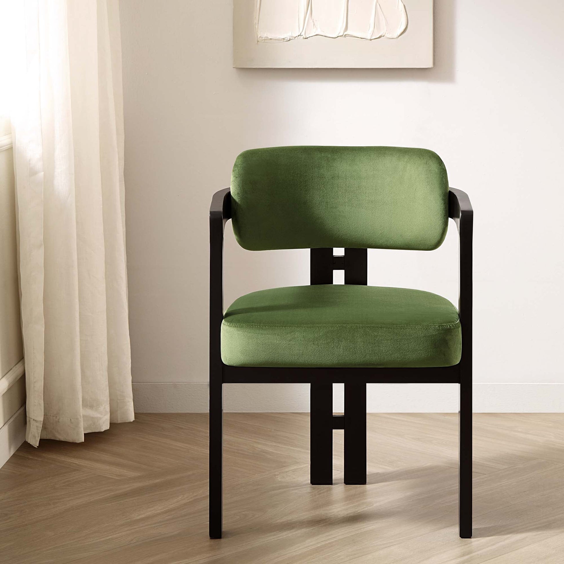 Fabriquée en bois massif, la structure de la chaise a été peinte en noir mat, associée à un siège et un dossier rembourrés en velours vert mousse pour un look classique.