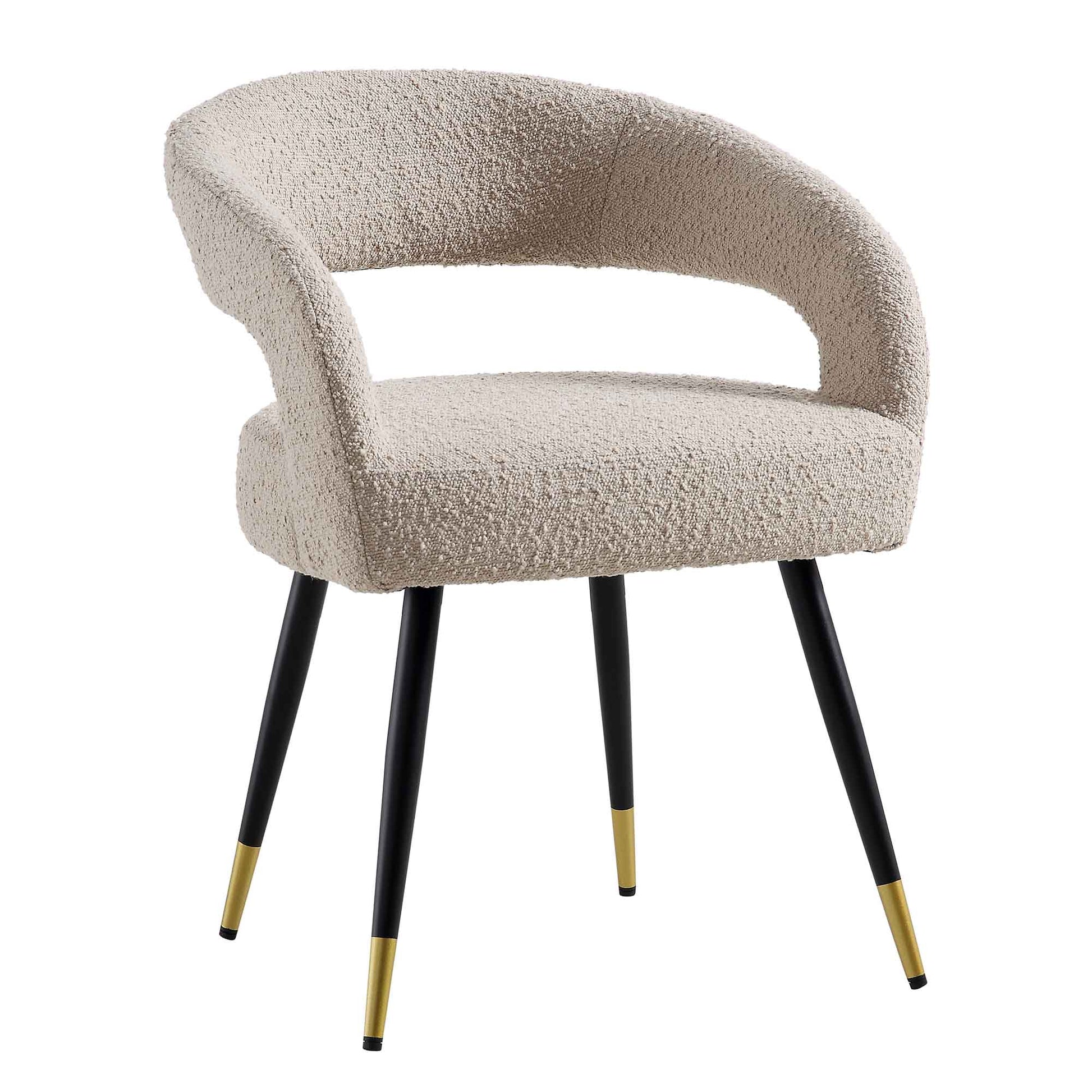 Le dossier incurvé découpé s'intègre parfaitement aux accoudoirs et à l'assise, associé à des pieds légèrement effilés avec une pointe dorée pour un look élégant.