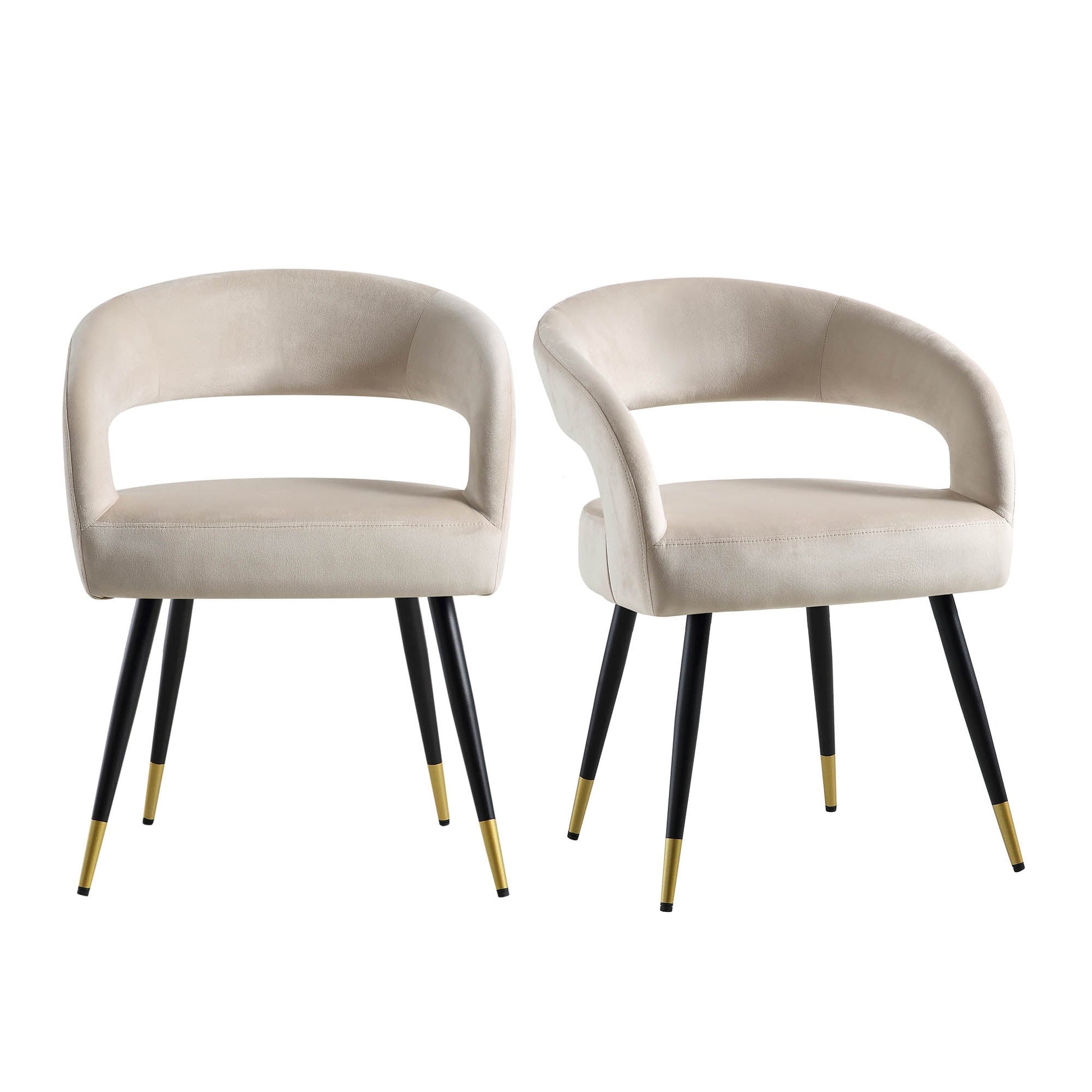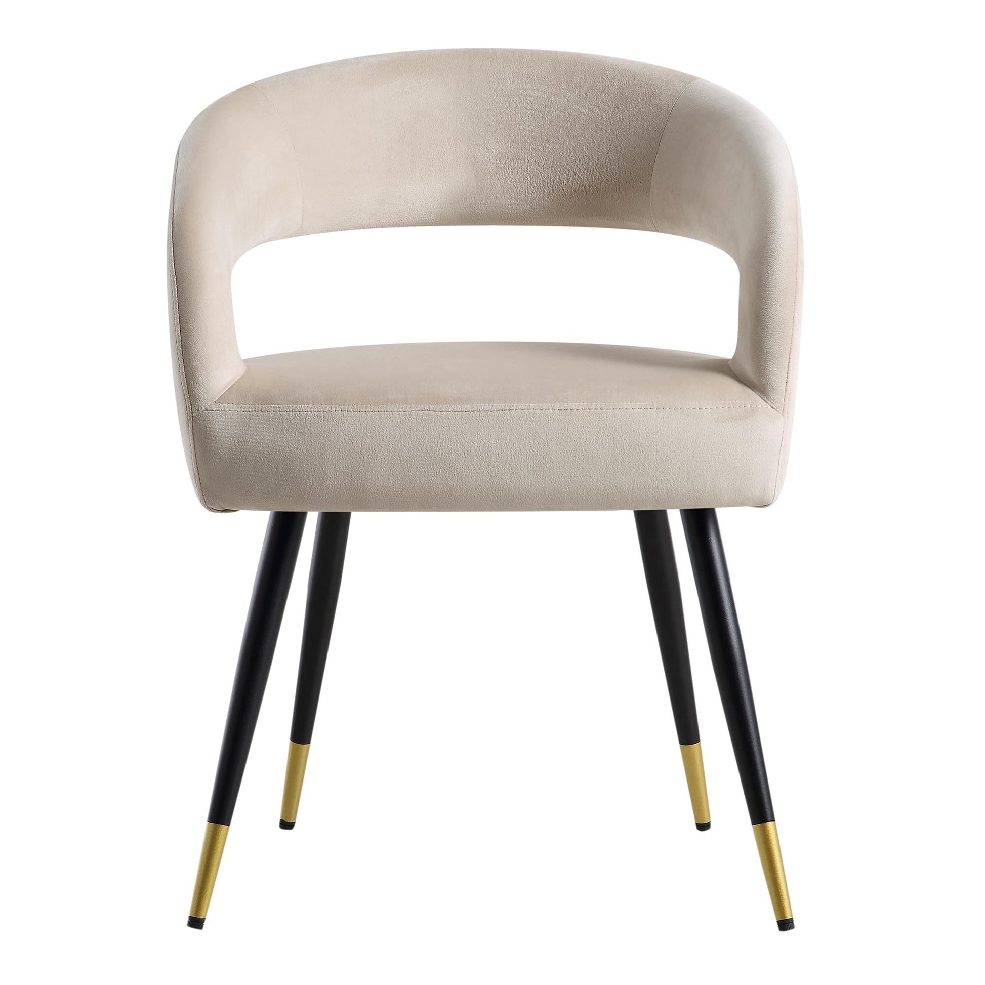 Le dossier incurvé découpé s'intègre parfaitement aux accoudoirs et à l'assise, associé à des pieds légèrement effilés avec une pointe dorée pour un look élégant.
