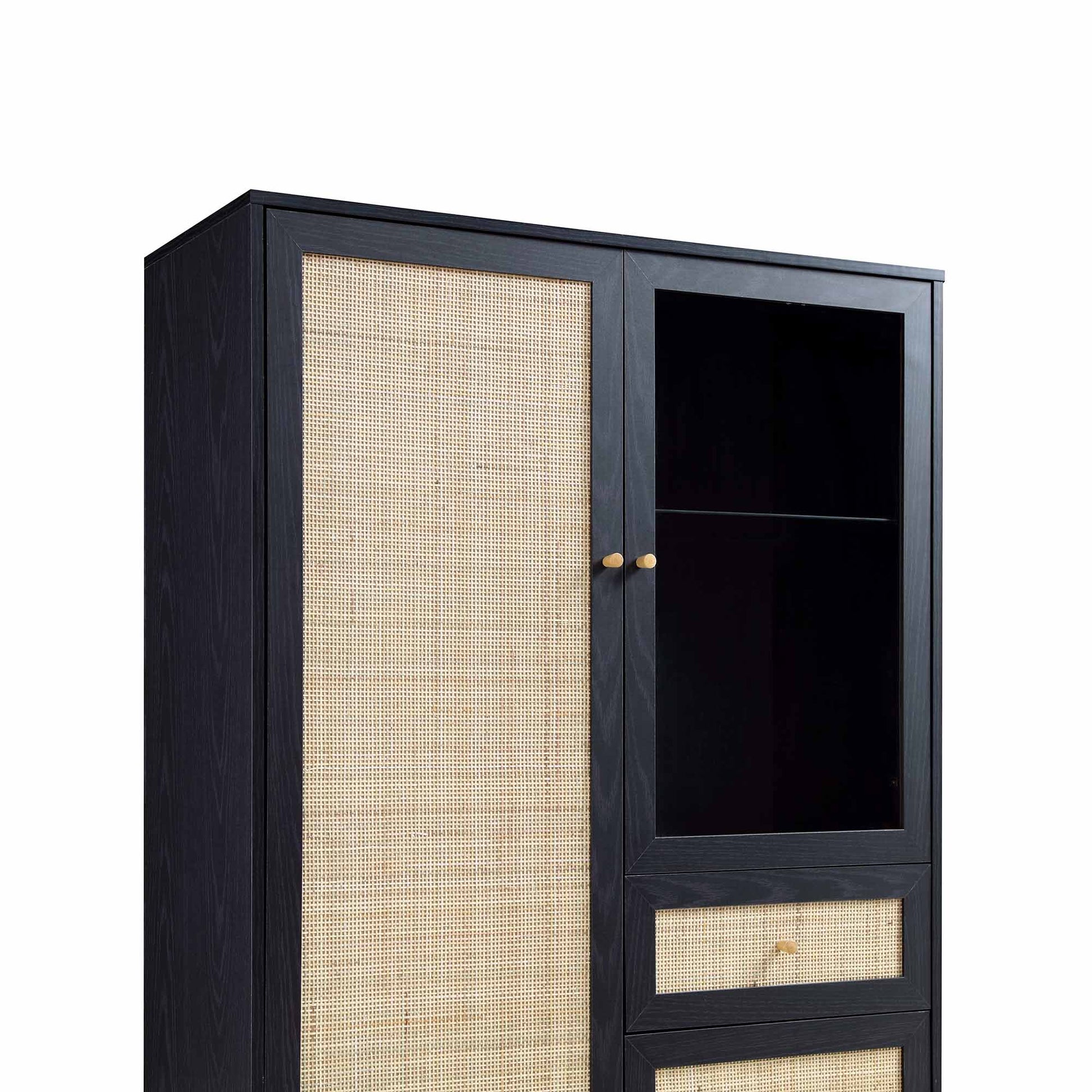 Des matériaux naturels rencontrent un design contemporain, notre vitrine Frances présente une combinaison raffinée de rotin, de bois et de verre, ce qui en fait une jolie pièce maîtresse dans vos espaces de vie.
