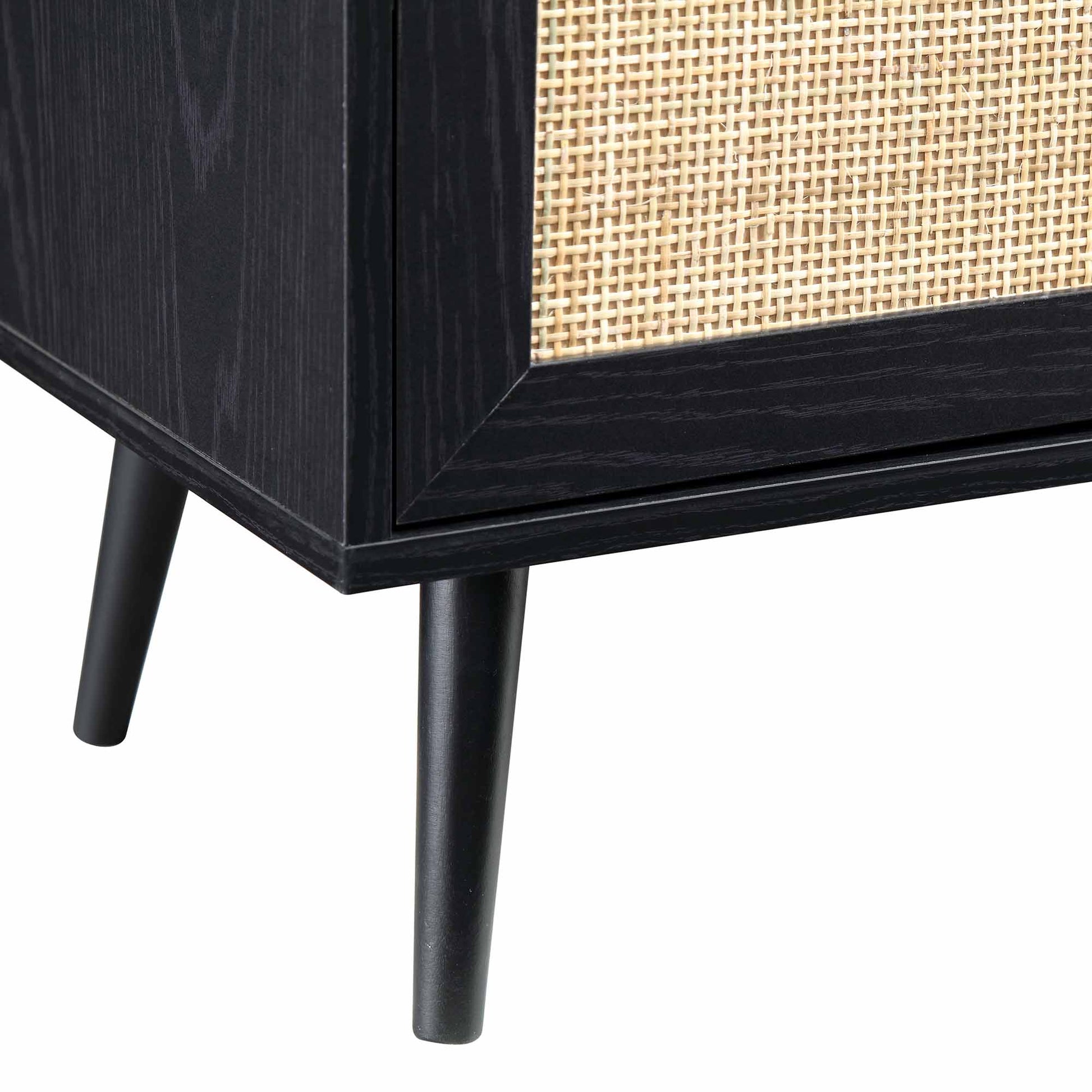 Les inserts en rotin naturel tissés à la main sur la porte de l'armoire et le tiroir se coordonnent avec la poignée et les pieds en bois massif pour créer un look chaleureux et terreux.