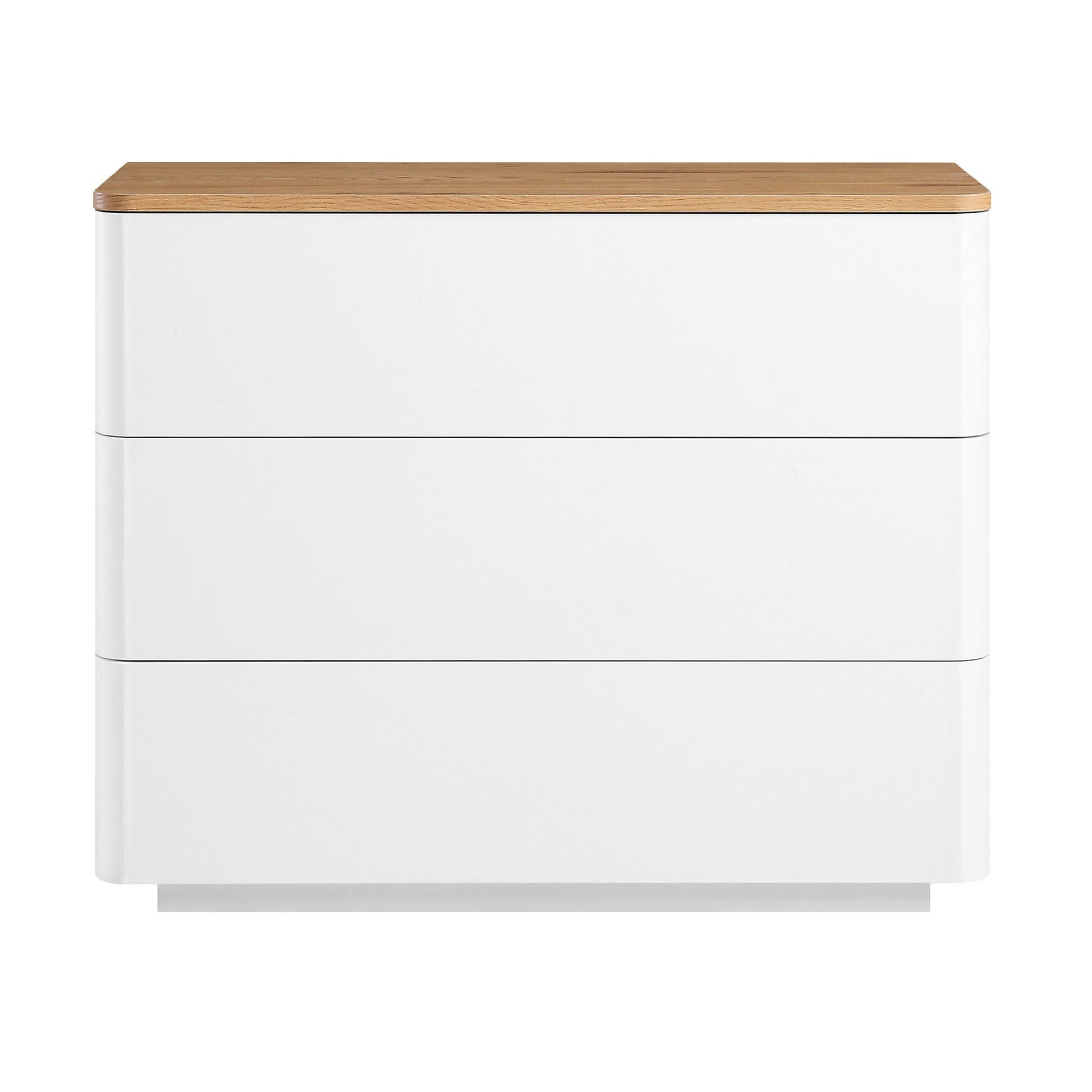 La commode est dotée de trois tiroirs de bonne taille sur glissières métalliques, offrant un espace de rangement pratique pour une pièce bien rangée. Son système d'ouverture par pression remplace astucieusement les poignées pour un style épuré.