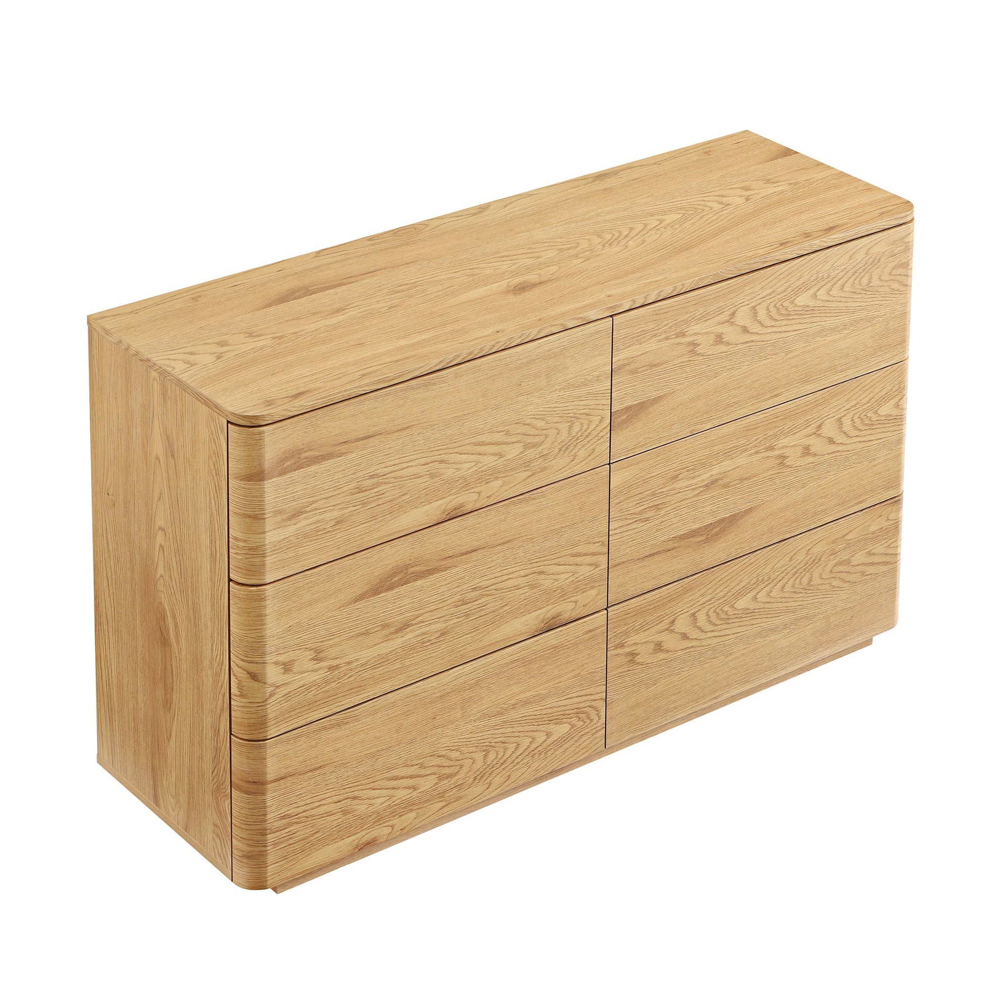 La commode est dotée de 6 tiroirs sur glissières métalliques, offrant un espace de rangement pratique pour une pièce bien rangée. Son système d'ouverture par pression remplace astucieusement les poignées pour un style épuré.