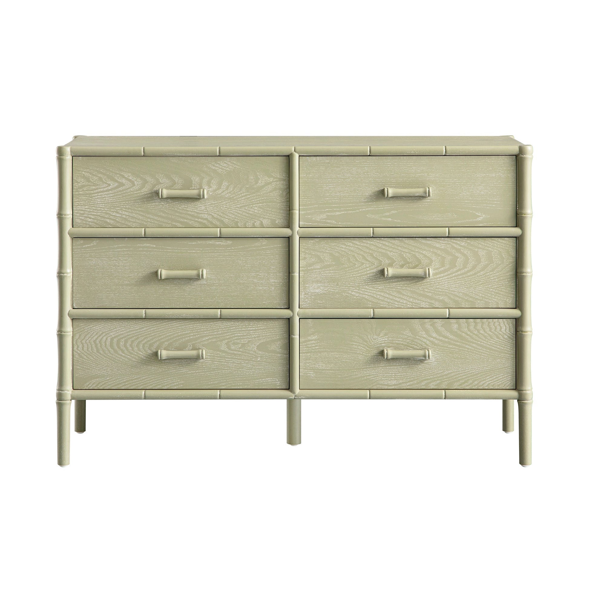 Complétez le look : illustré avec la commode à 6 tiroirs en faux bambou vert sauge d'Elstowe, notre tapis en laine crème texturé et touffeté à la main Lourdes .