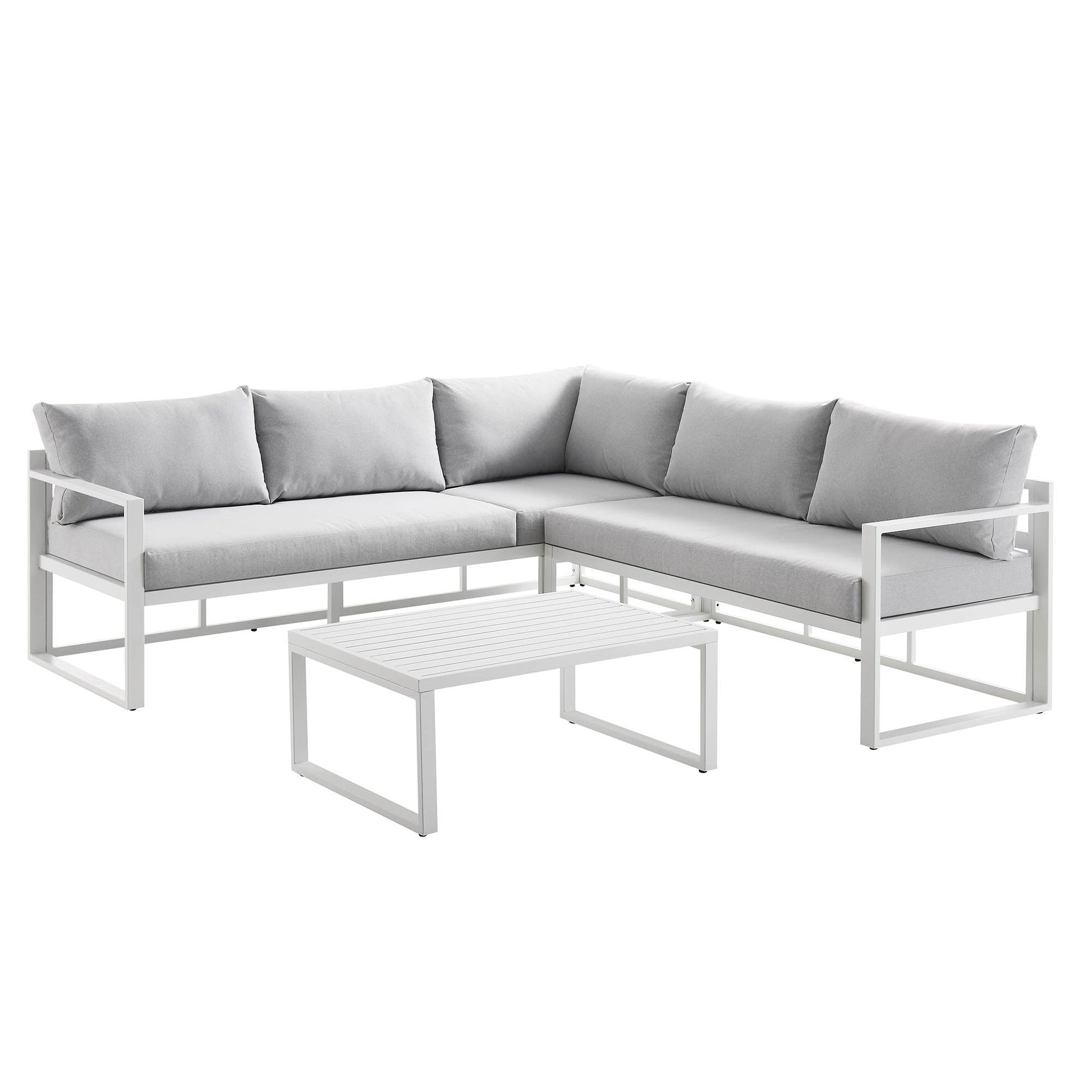Les coussins généreusement rembourrés sont recouverts d'un tissu résistant aux UV dans une élégante couleur gris clair pour se coordonner avec le cadre blanc.