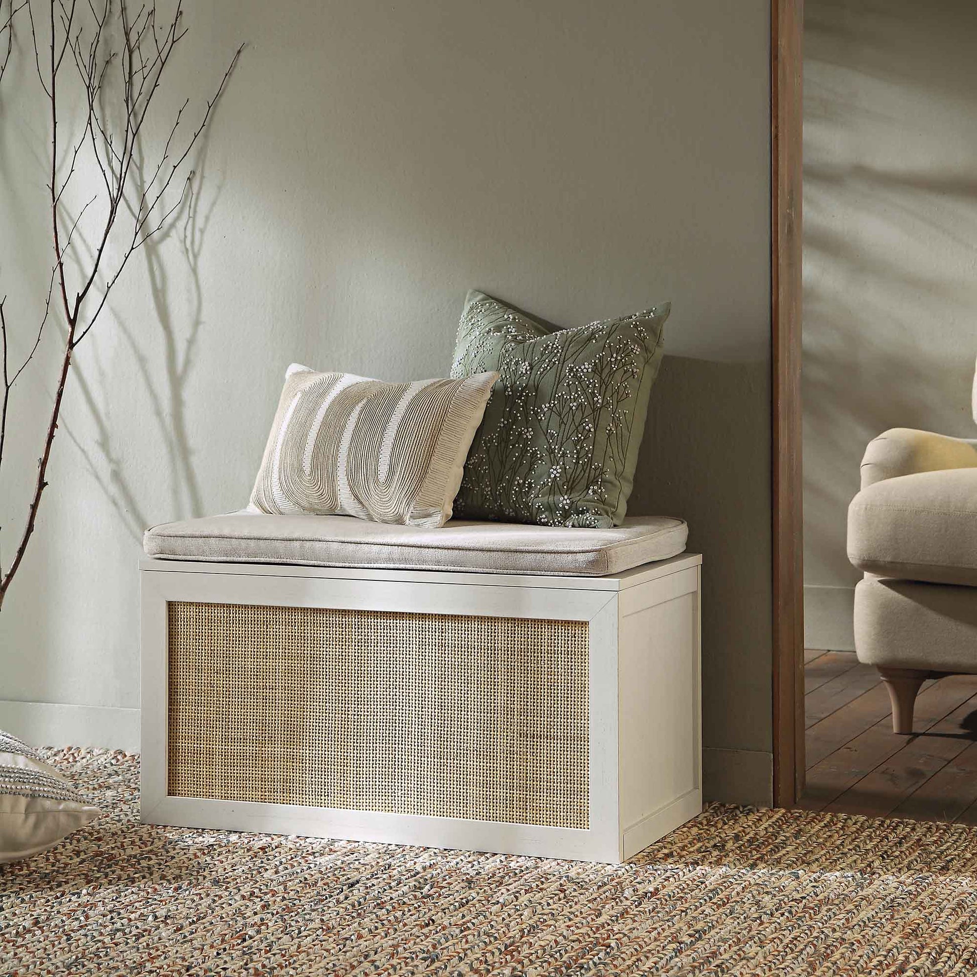 Complétez le look : sur la photo avec notre tabouret de rangement double en rotin tissé Frances, nous voyons notre tapis en jute tressé à la main Aurora Teal et Bronze , notre canapé en tissu avoine Daphnis , l'oreiller en cordon scintillant Odilla de la collection Luxe et notre oreiller vert sauge perlé à la main Meadow.