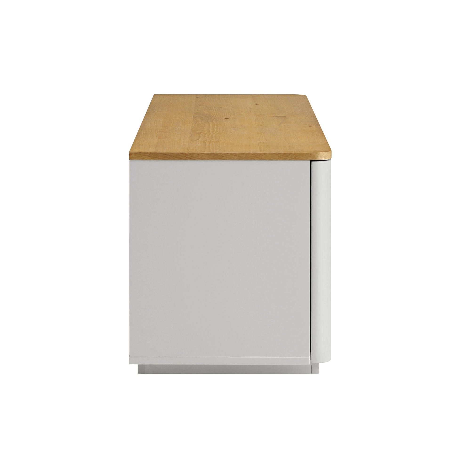 Le meuble TV présente des angles arrondis. Sa finition gris tourterelle mat s'harmonise avec le plateau en chêne massif pour un style doux et chaleureux.