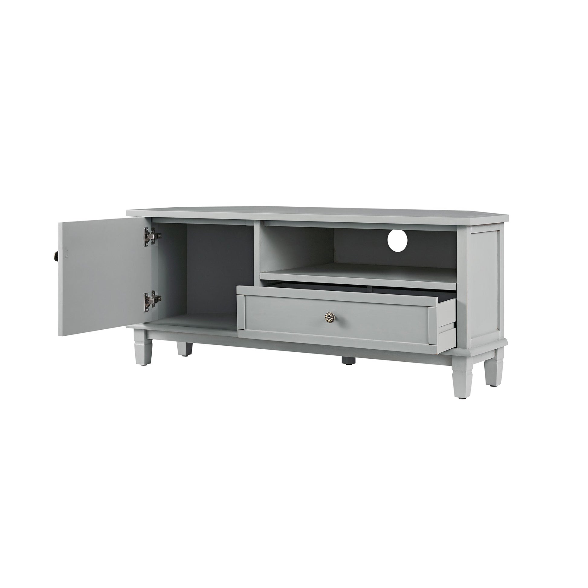 Une étagère ouverte et un tiroir unique offrent de l'espace pour les appareils multimédias et les accessoires, tandis que le placard offre un rangement caché.
