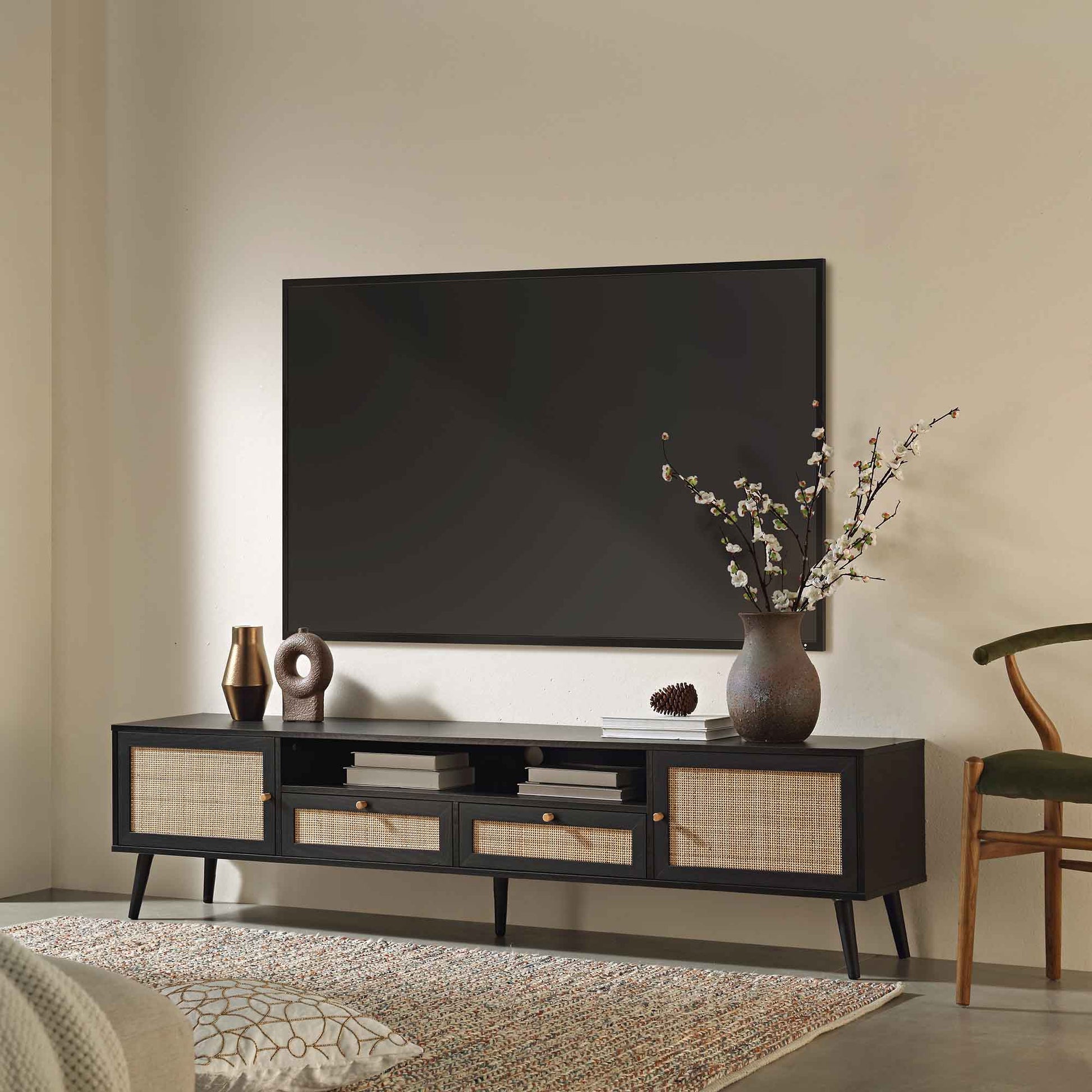 Complétez le look : sur la photo avec notre meuble TV en rotin tissé Frances de 200 cm de large se trouve notre tapis en jute tressé à la main Aurora bleu sarcelle et bronze