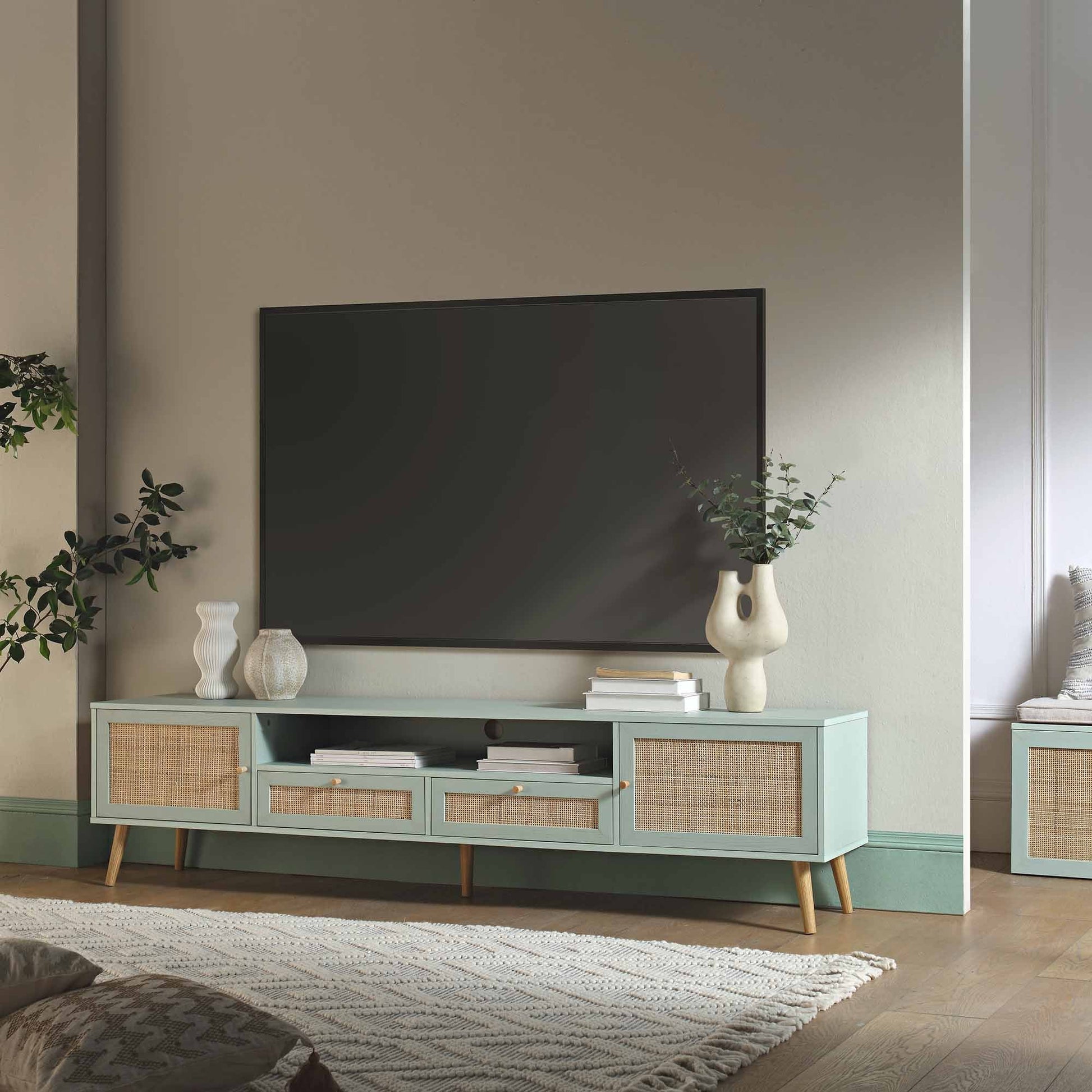 Les façades de portes en rotin naturel tissé à la main se coordonnent avec une finition effet grain de bois et des pieds à lattes pour un look scandinave rafraîchi.