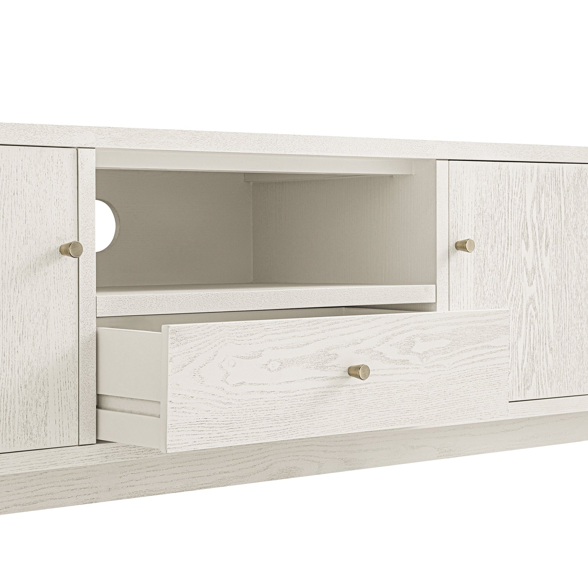 Notre meuble TV large Maude est doté d'un placage en frêne massif, associé à des poignées en métal effet laiton antique.