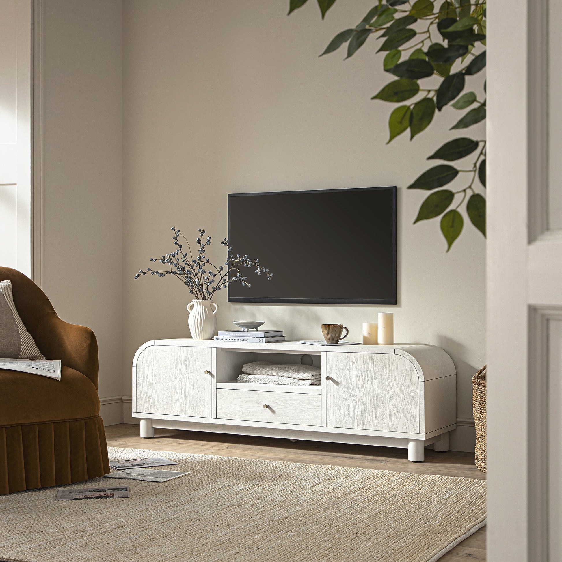Complétez le look : sur la photo avec notre meuble TV en frêne blanc délavé Maude se trouve notre tapis en jute crème tressé à la main Aurora .