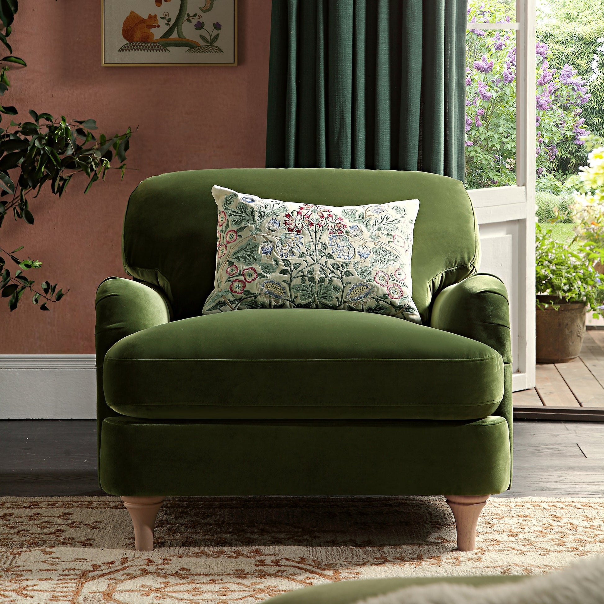 Complétez le look : sur la photo avec notre canapé 1 place en velours vert Daphnis Fern, vous trouverez notre tapis traditionnel touffeté à la main de Varanasi et notre coussin brodé à la main en velours perlé de la collection Botanica.