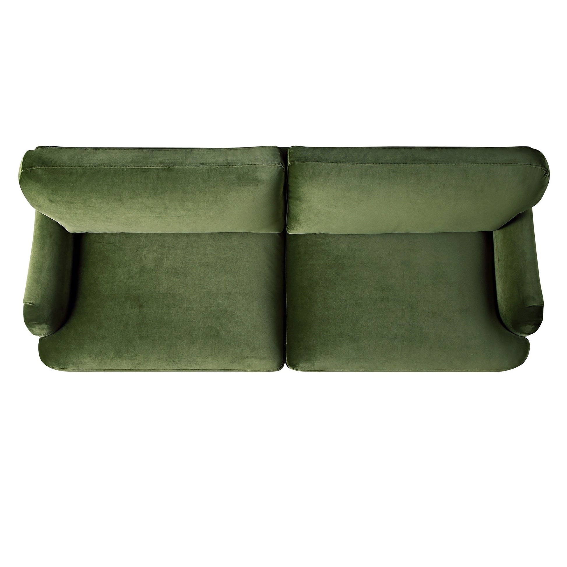 Conçu avec un beau dossier incurvé et des accoudoirs touffetés à la main, le canapé vous invite à vous détendre confortablement et avec style