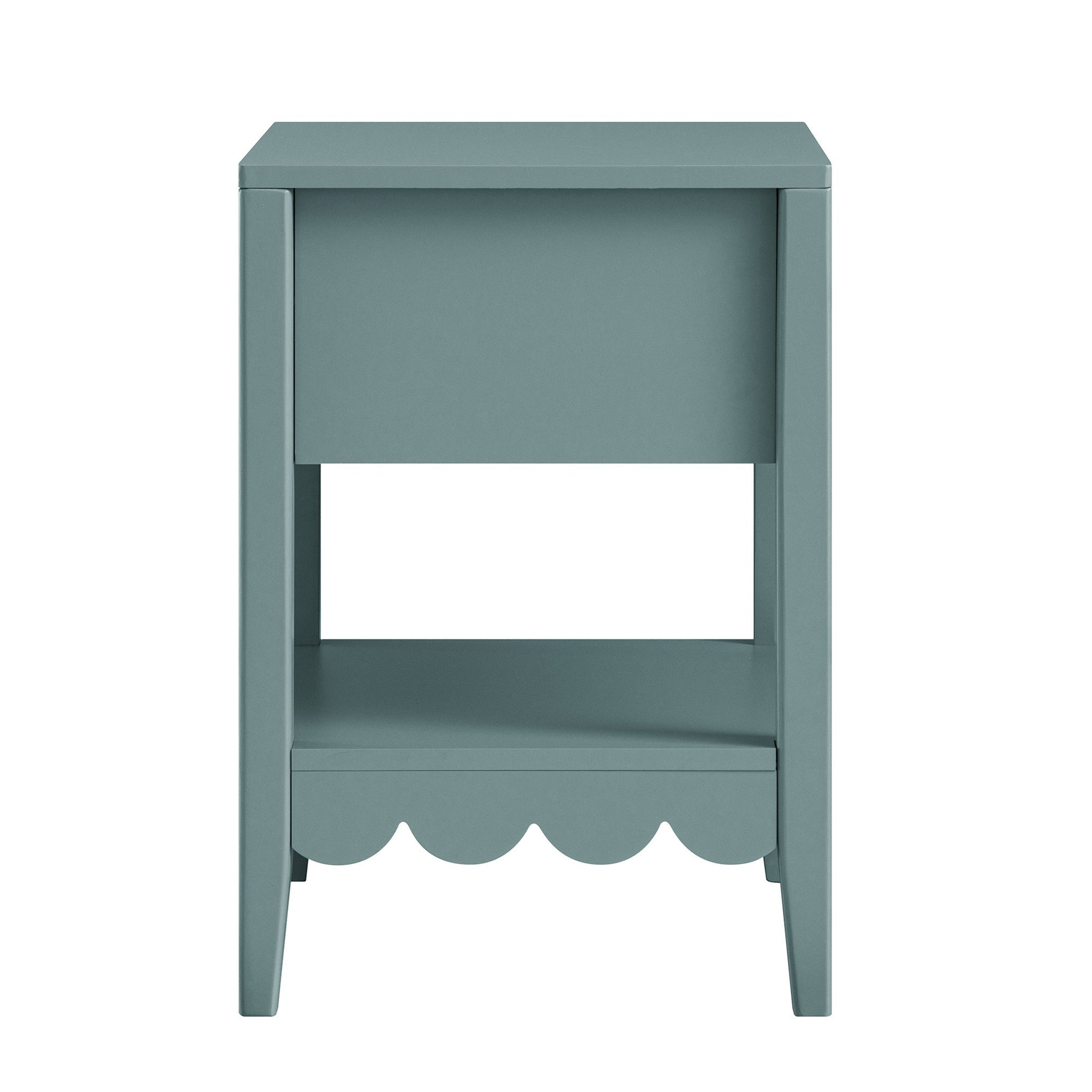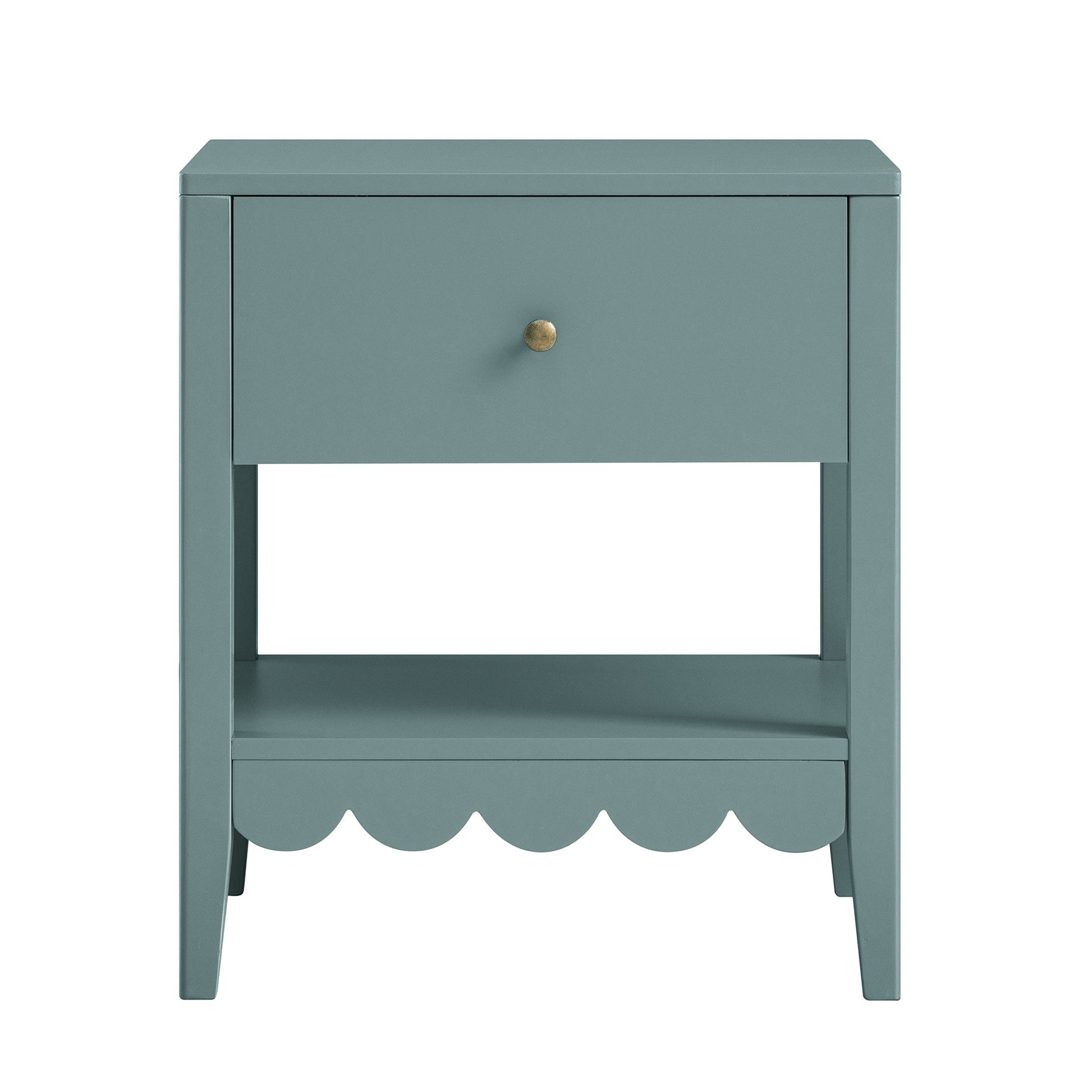 Complétez le look : sur la photo avec notre table de chevet à bords festonnés Henley, nous voyons notre lit ottoman en tissu rayé bleu ardoise incurvé Egerie et notre tapis en jute crème tressé à la main Aurora.
