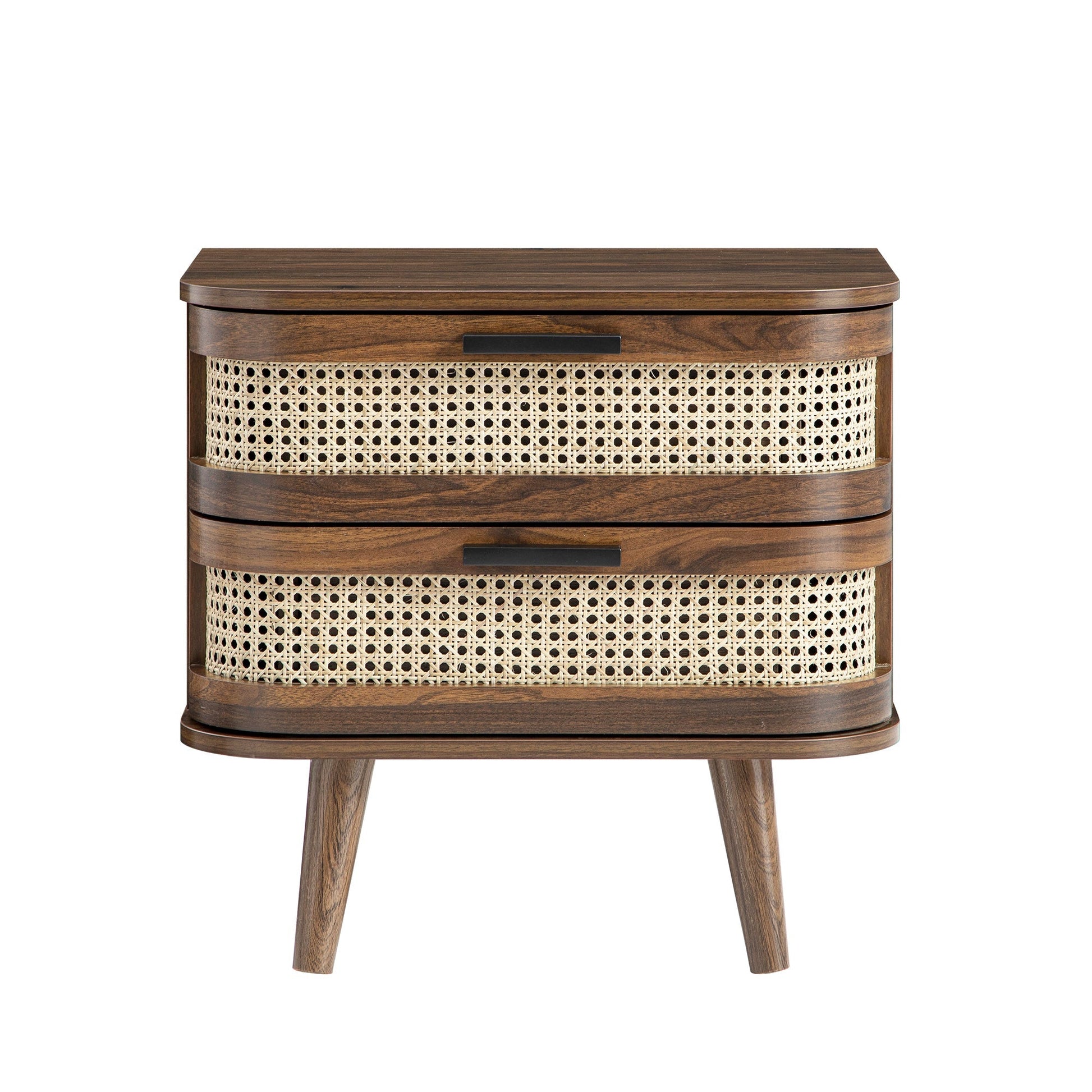 La riche finition effet noyer rehausse la beauté naturelle du cadre incurvé, parfaitement complétée par le tissage aéré en rotin des façades des tiroirs.