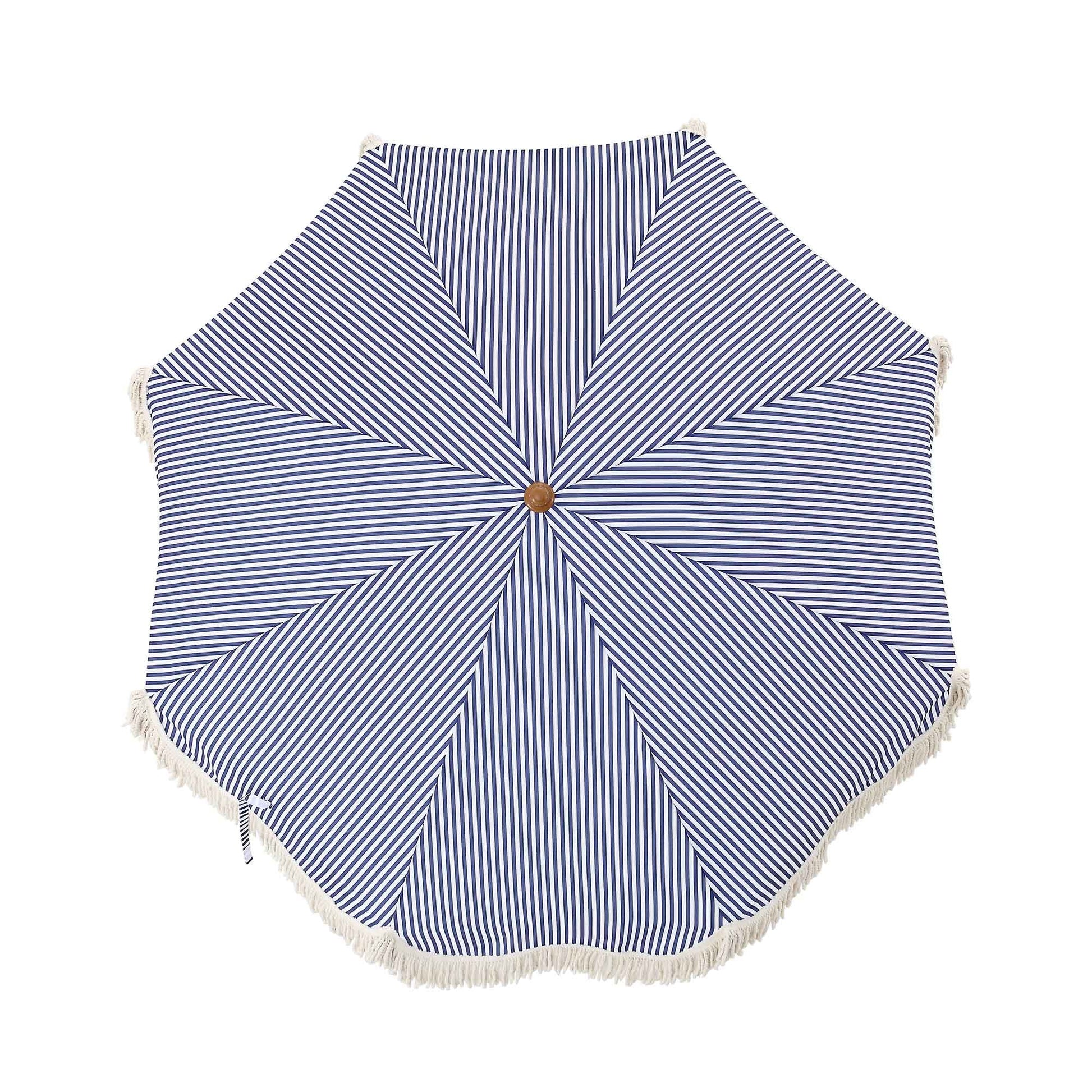 Doté d'une canopée à rayures bleues et blanches avec une frange de couleur beige, le parasol peut s'incliner grâce à une charnière de poteau réglable.