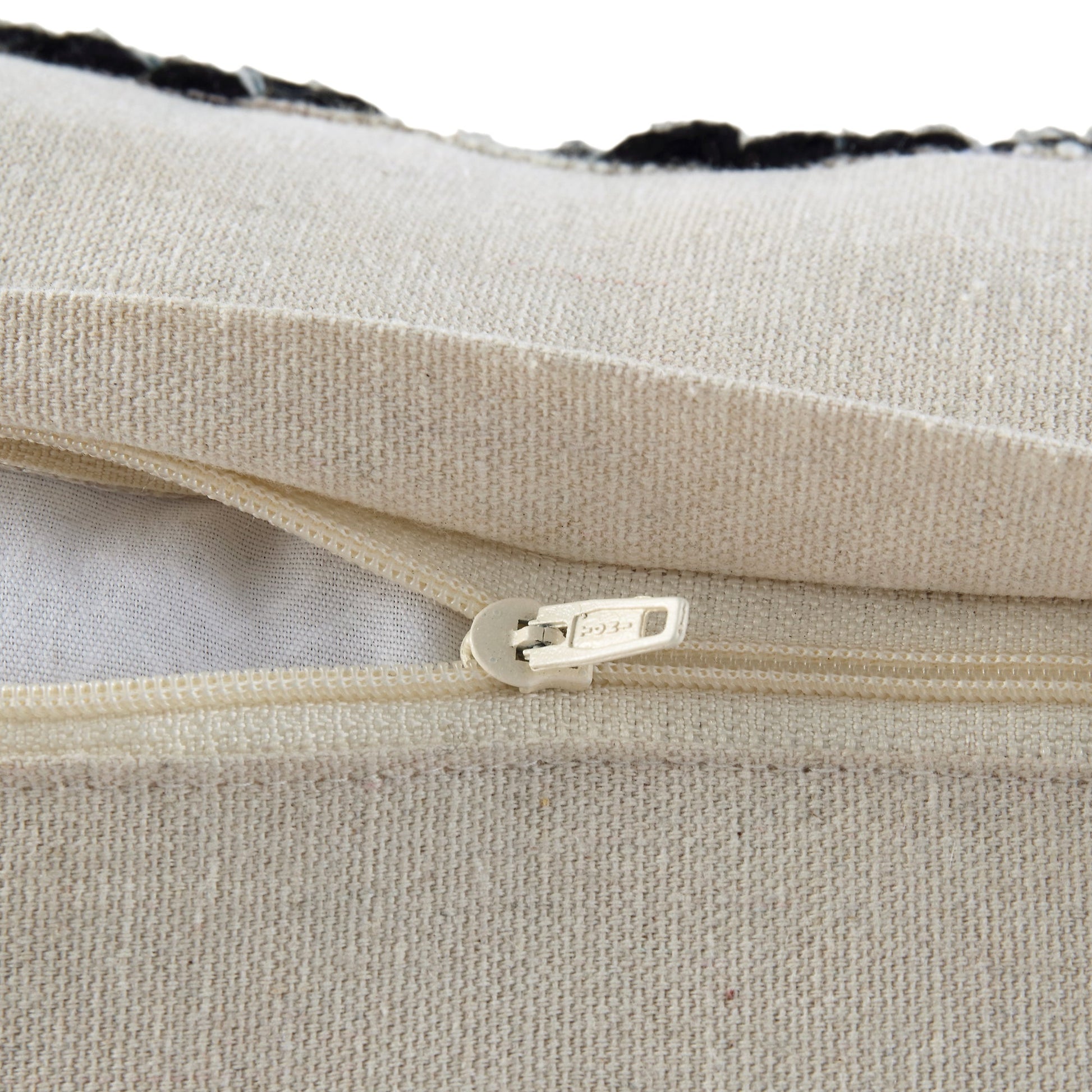 L'oreiller géométrique monochrome Baja présente un motif brodé sur une base en coton et soie tissée, utilisant un cordon noir et des points de conchage spécialisés.