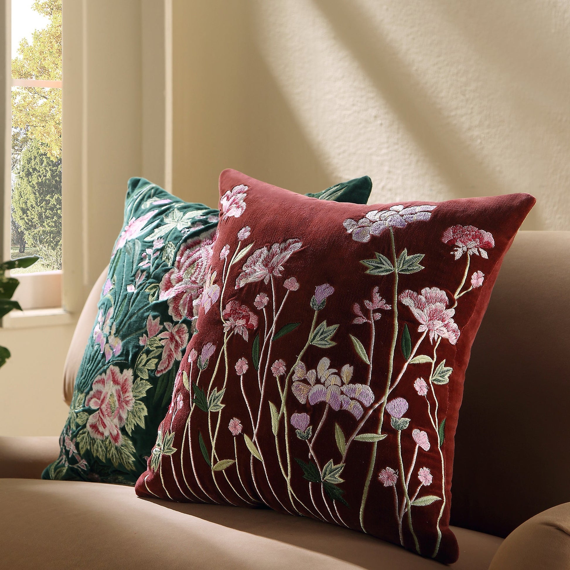 Complétez le look : Notre causeuse en velours camel Daphnis est présentée avec notre coussin en velours mûrier de la collection Botanica.