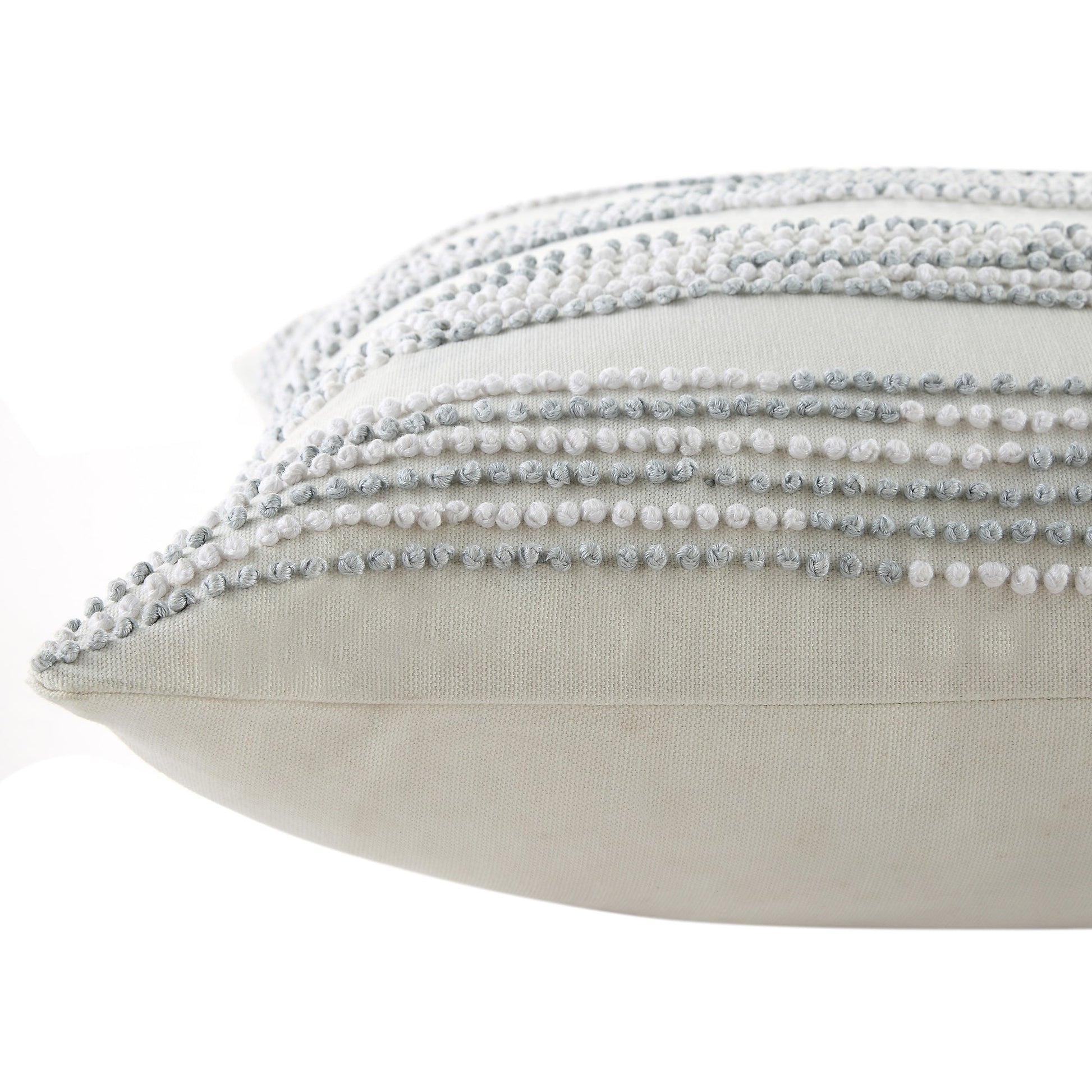 Doté de nœuds français faits à la main dans des tons blancs et bleus doux sur une base en coton canard blanc impeccable, cet oreiller a un style et une texture charmants.
