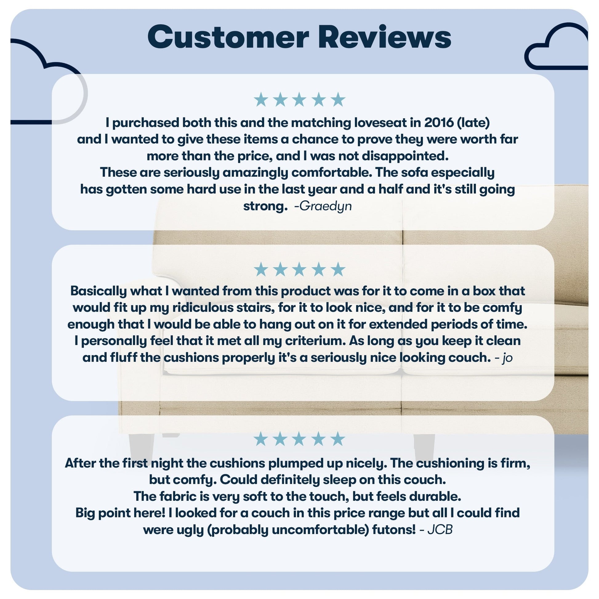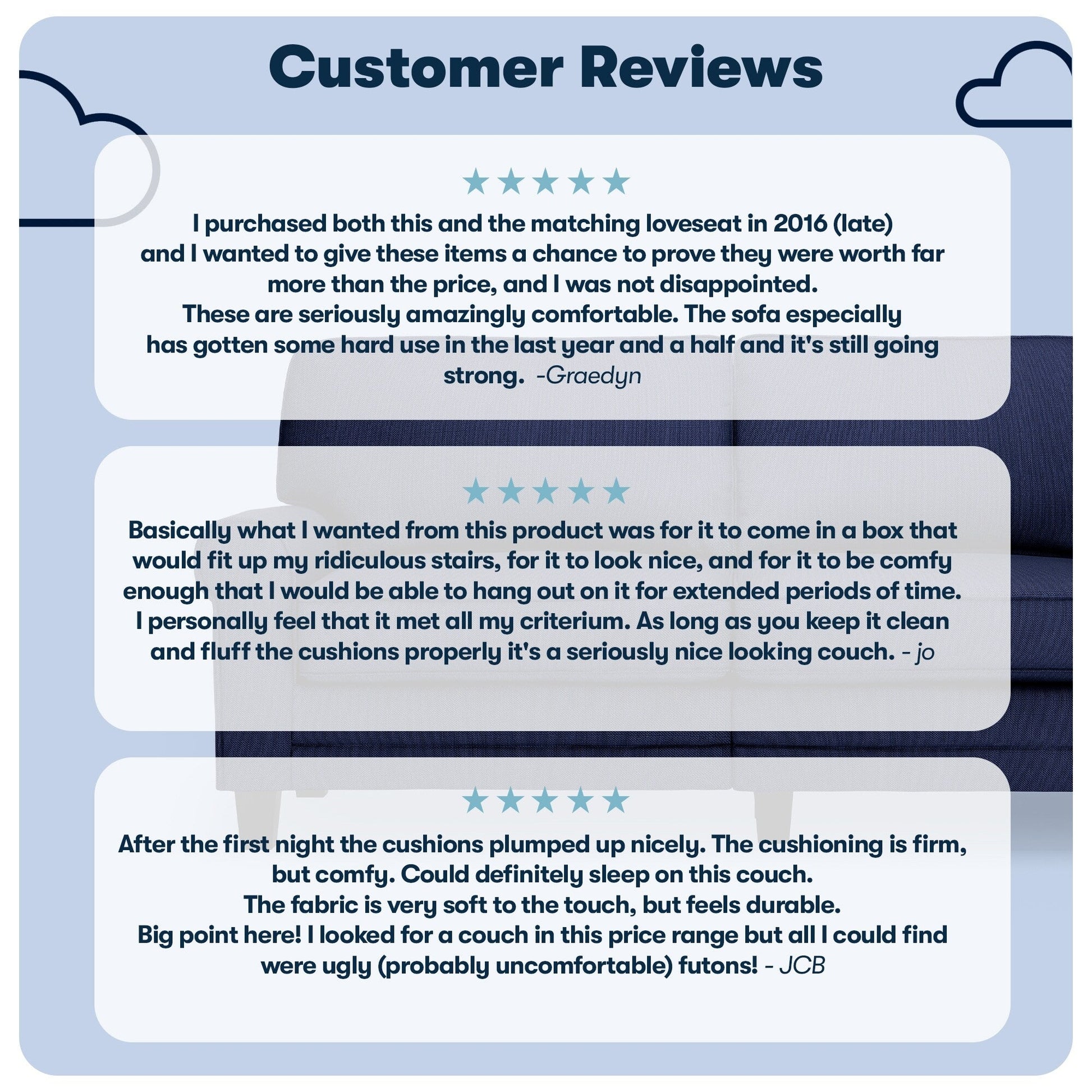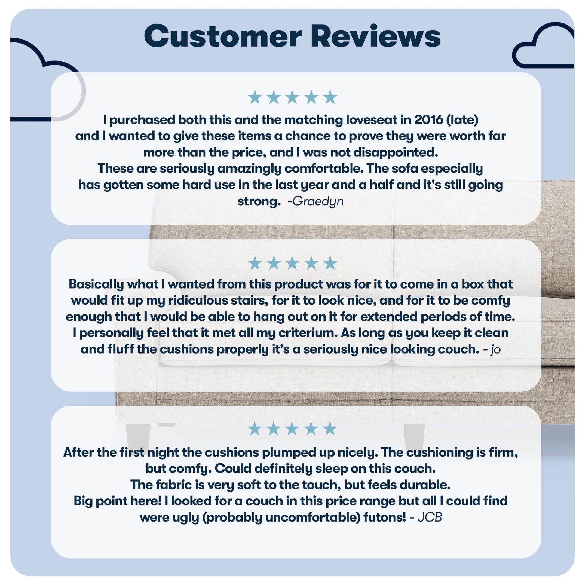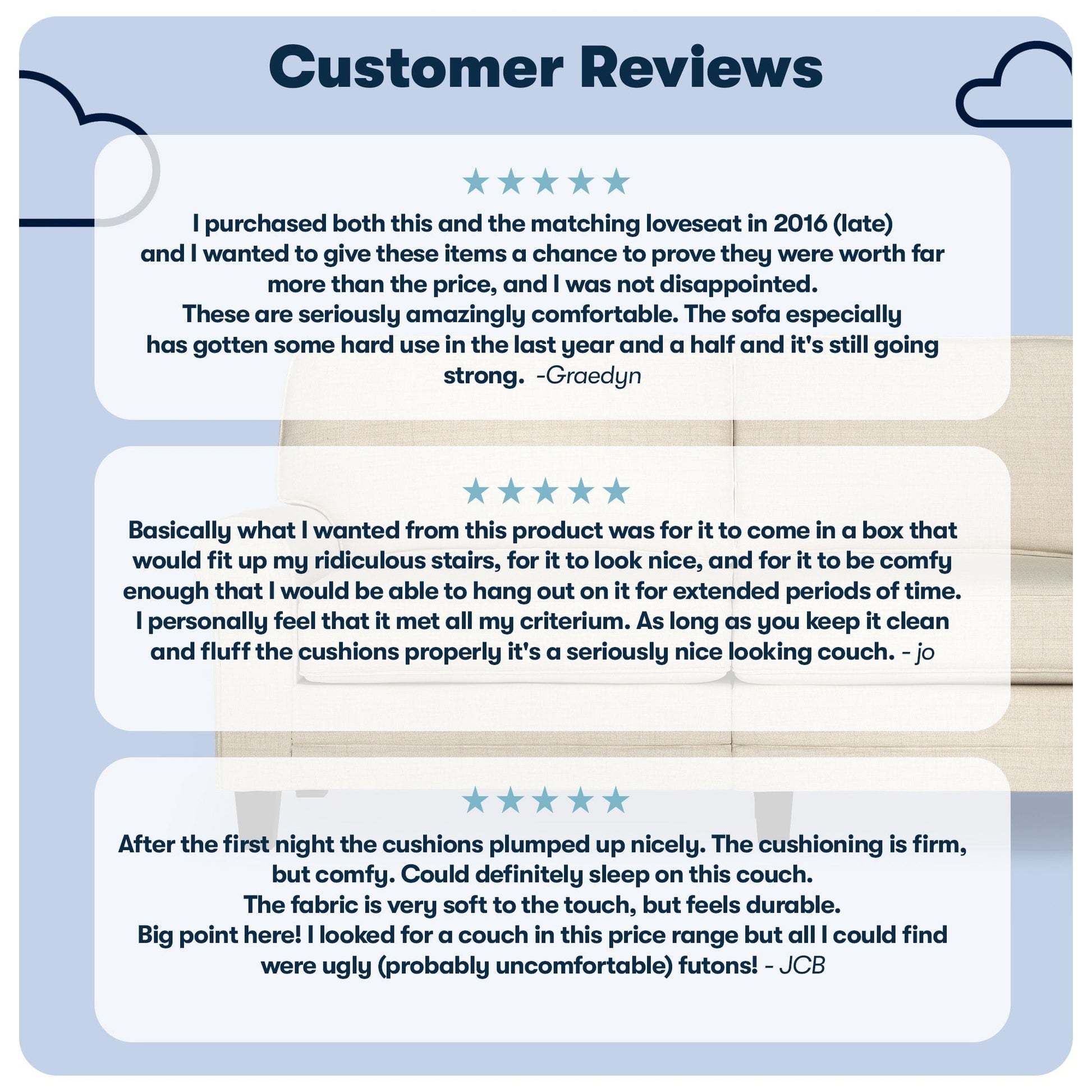 • Détendez-vous : Les dossiers amovibles sont généreusement garnis de fibres douces et soutenus par des sangles structurées pour plus de confort et de soutien. Les coussins d'assise à ressorts ensachés, garnis de mousse haute densité, offrent une assise semi-moelleuse et sont déhoussables pour un nettoyage facile.