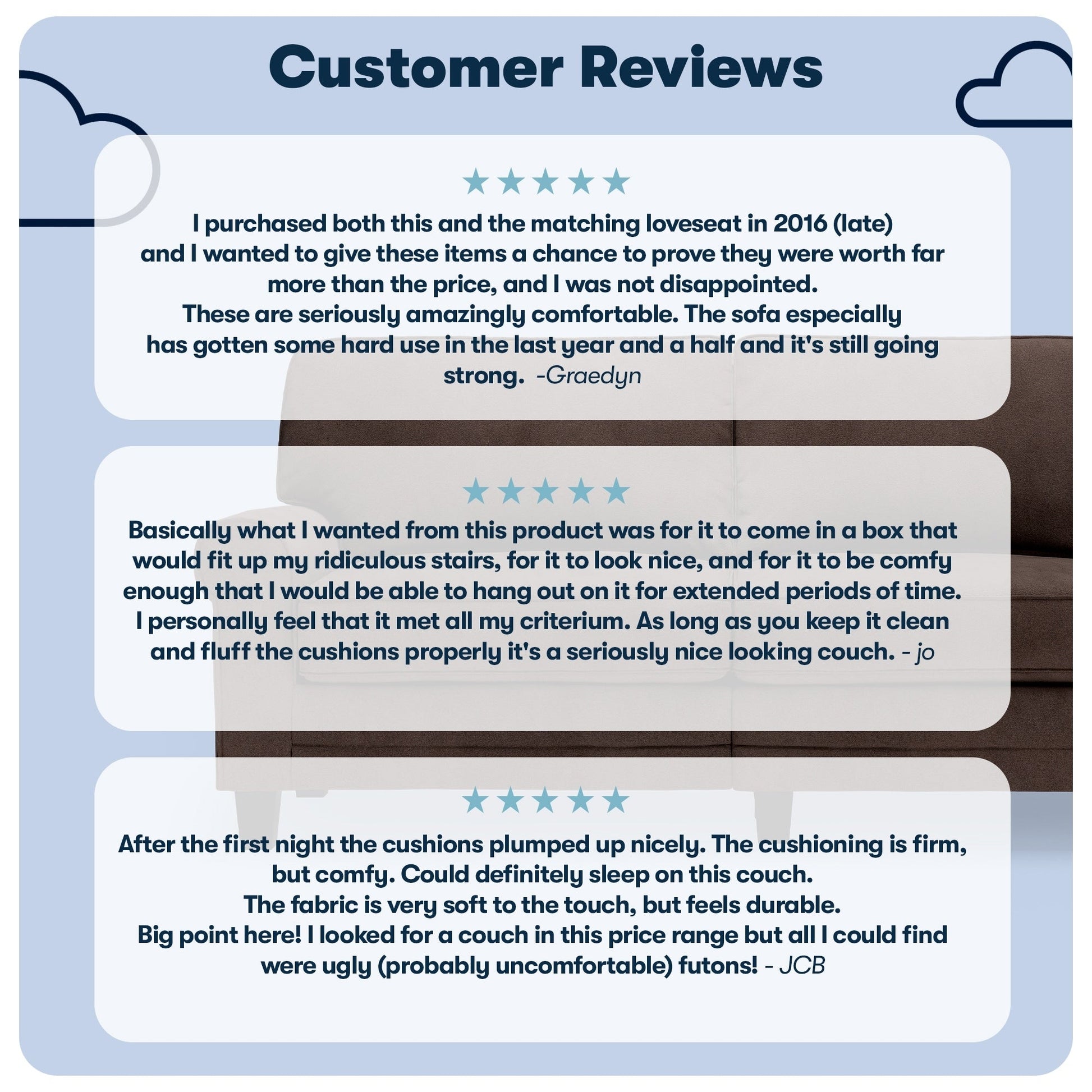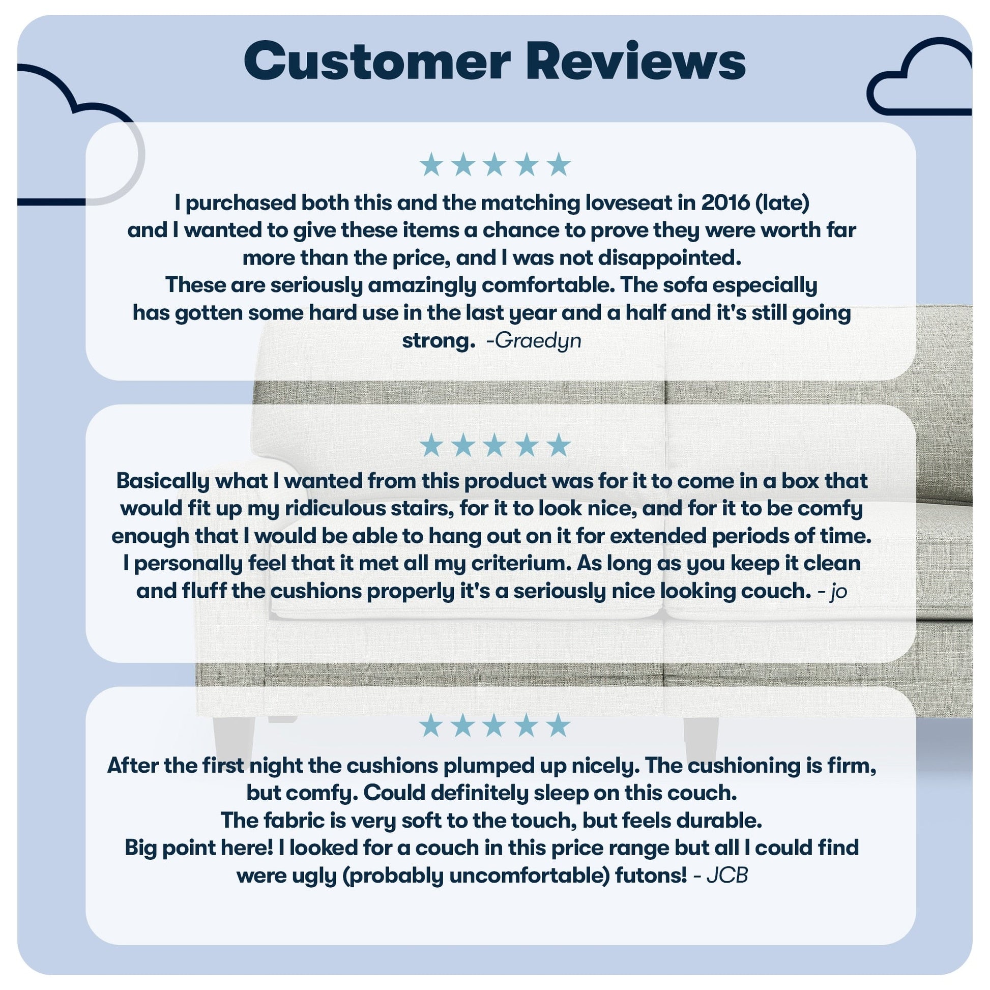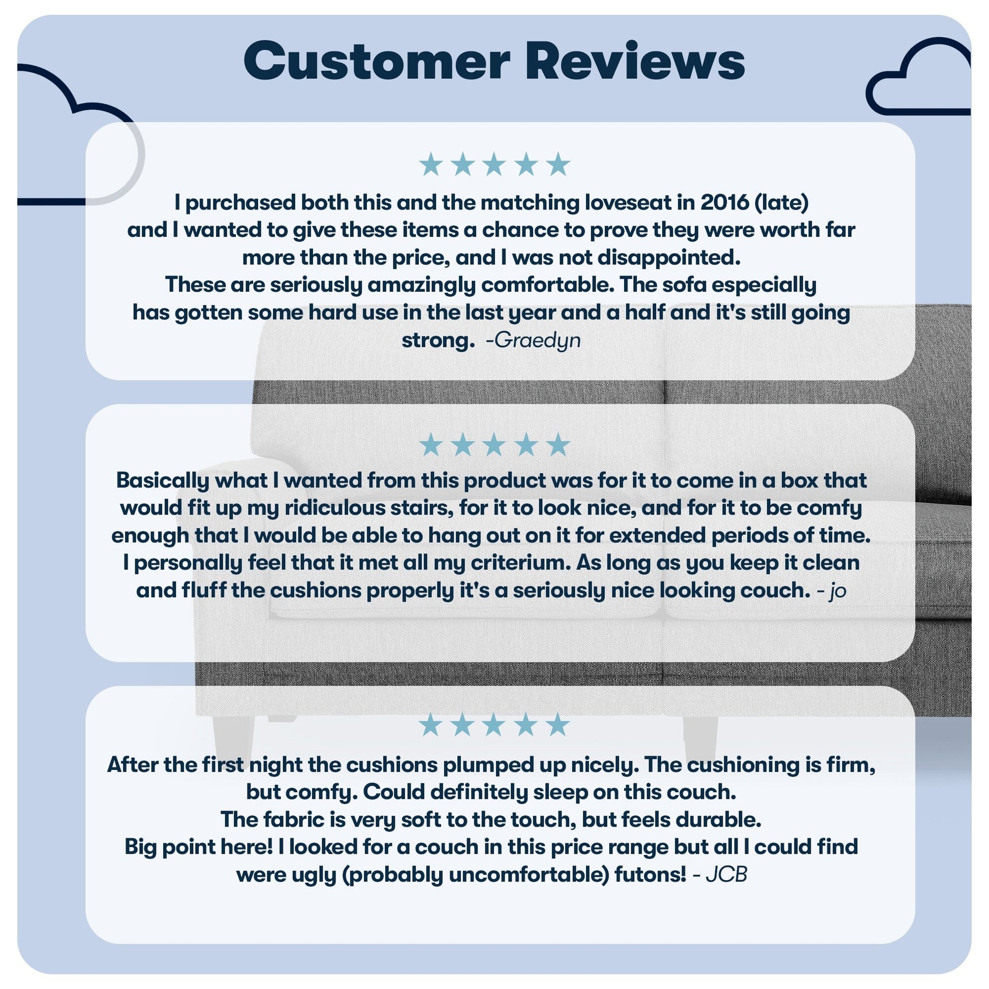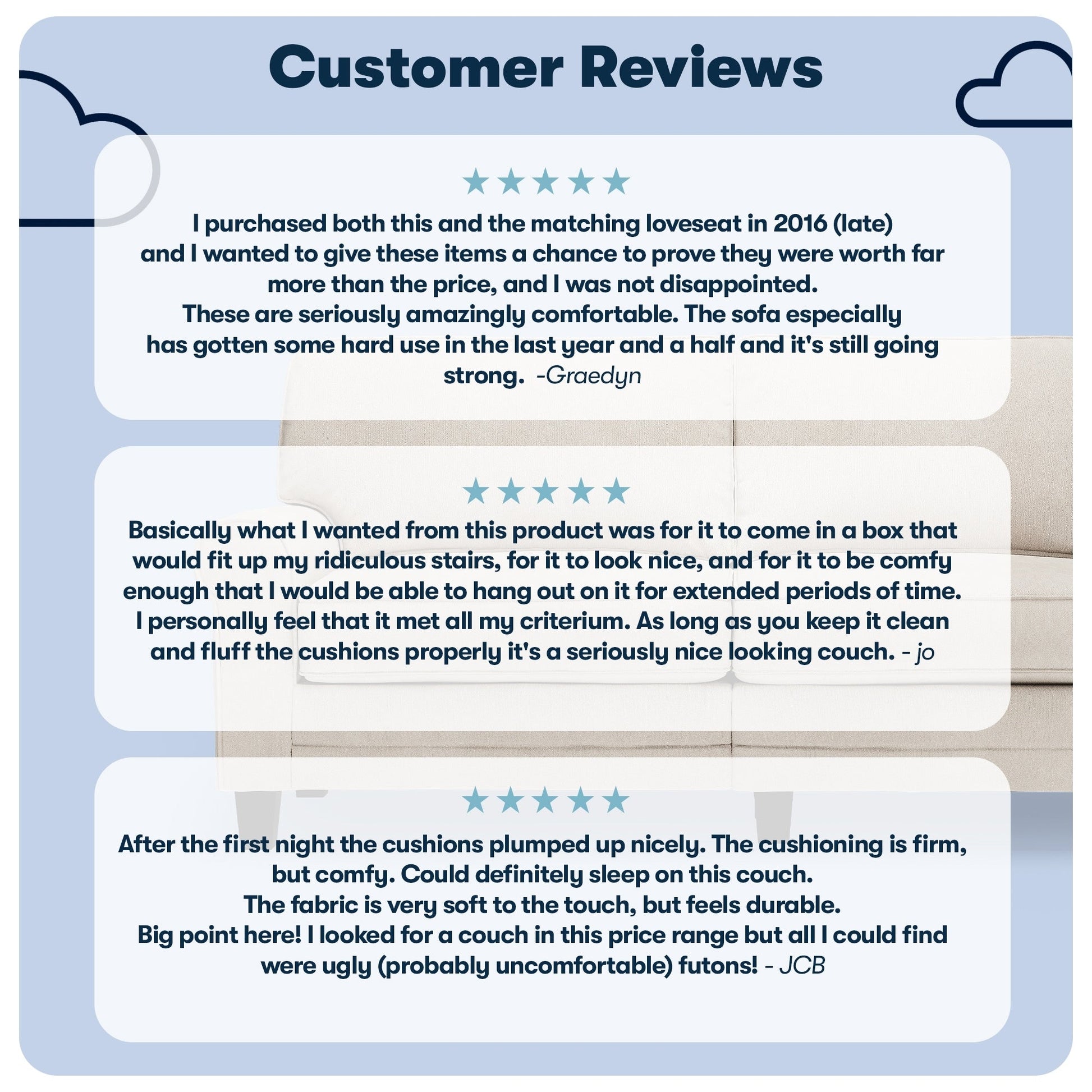 • Détendez-vous : Les dossiers amovibles sont généreusement garnis de fibres douces et soutenus par des sangles structurées pour plus de confort et de soutien. Les coussins d'assise à ressorts ensachés, garnis de mousse haute densité, offrent une assise semi-moelleuse et sont déhoussables pour un nettoyage facile.