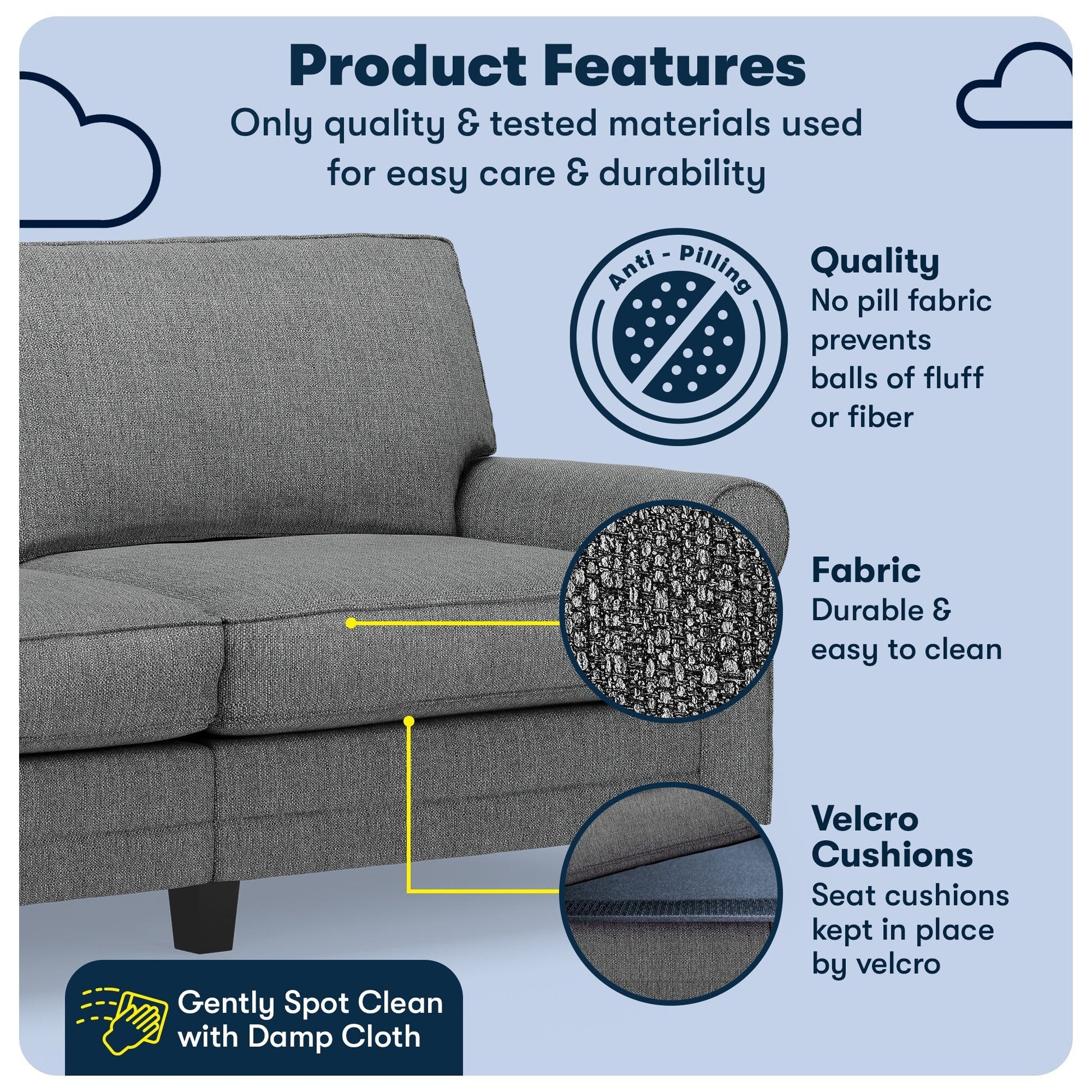 • Classique moderne : allie un design traditionnel et minimaliste avec des accoudoirs roulés pour un look élégant et moderne. Revêtement en polyester anti-boulochage avec bords passepoilés pour une finition sur mesure, disponible en 12 coloris. Facile à nettoyer et à entretenir.