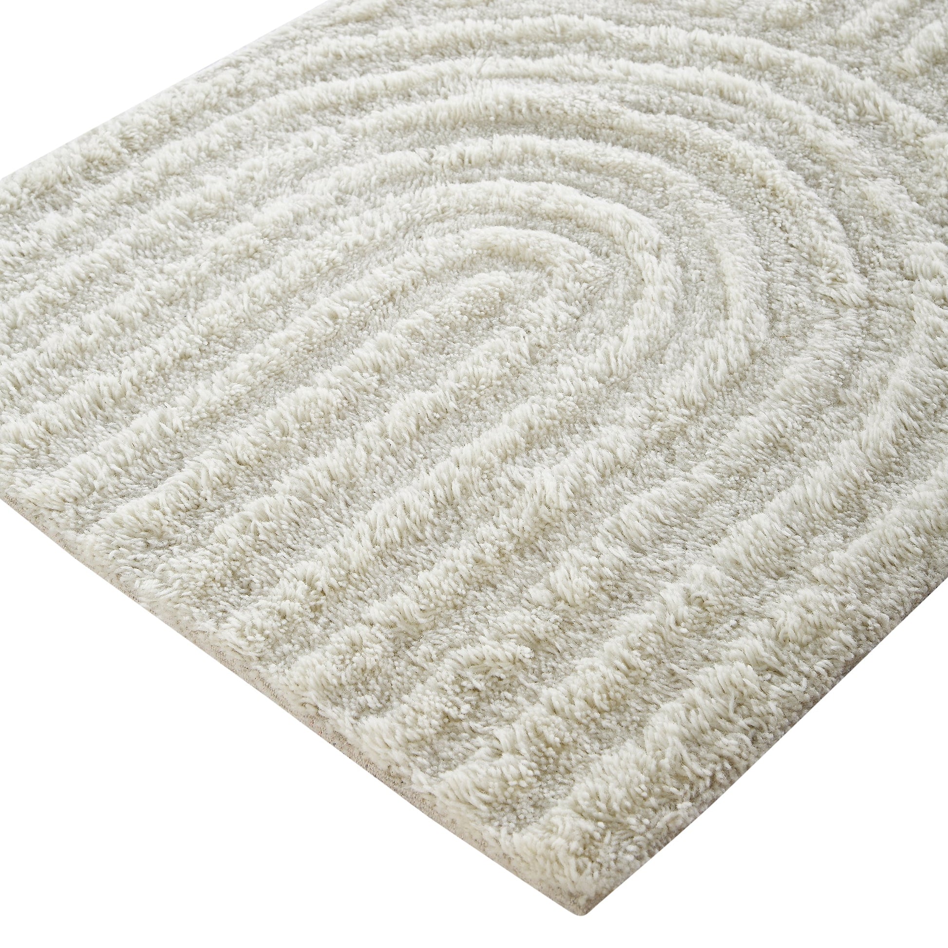 Complétez le look : sur la photo avec le tapis de couloir en laine de Nouvelle-Zélande touffeté à la main Geo Curve Cream, se trouve notre commode concave à 3 tiroirs Thalia, blanc délavé .