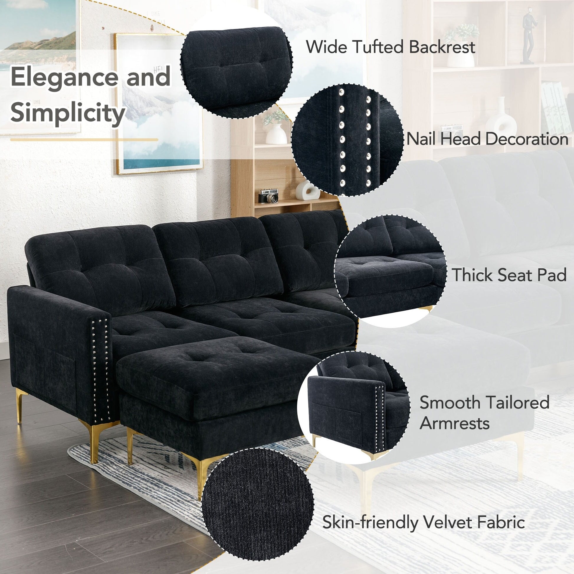 • Ce canapé convertible en L avec pouf amovible apporte élégance moderne et flexibilité à votre espace. Revêtu de velours doux et doté de coussins capitonnés, il est doté de poches de rangement, de pieds dorés et d'une structure robuste, pour un confort et un style harmonieux dans n'importe quelle pièce.