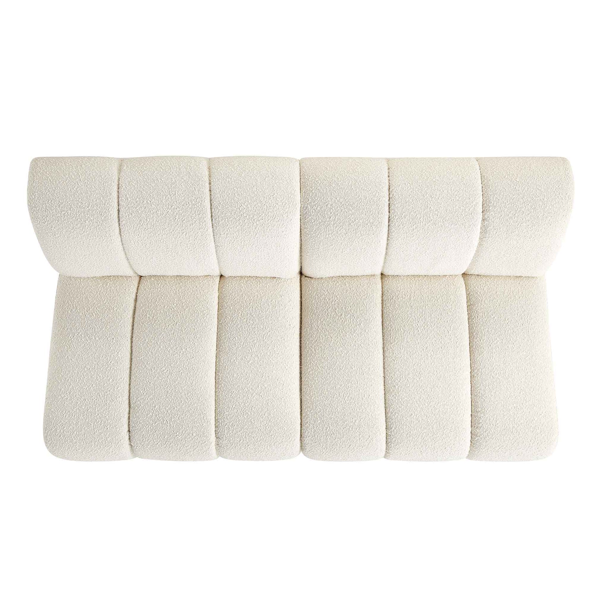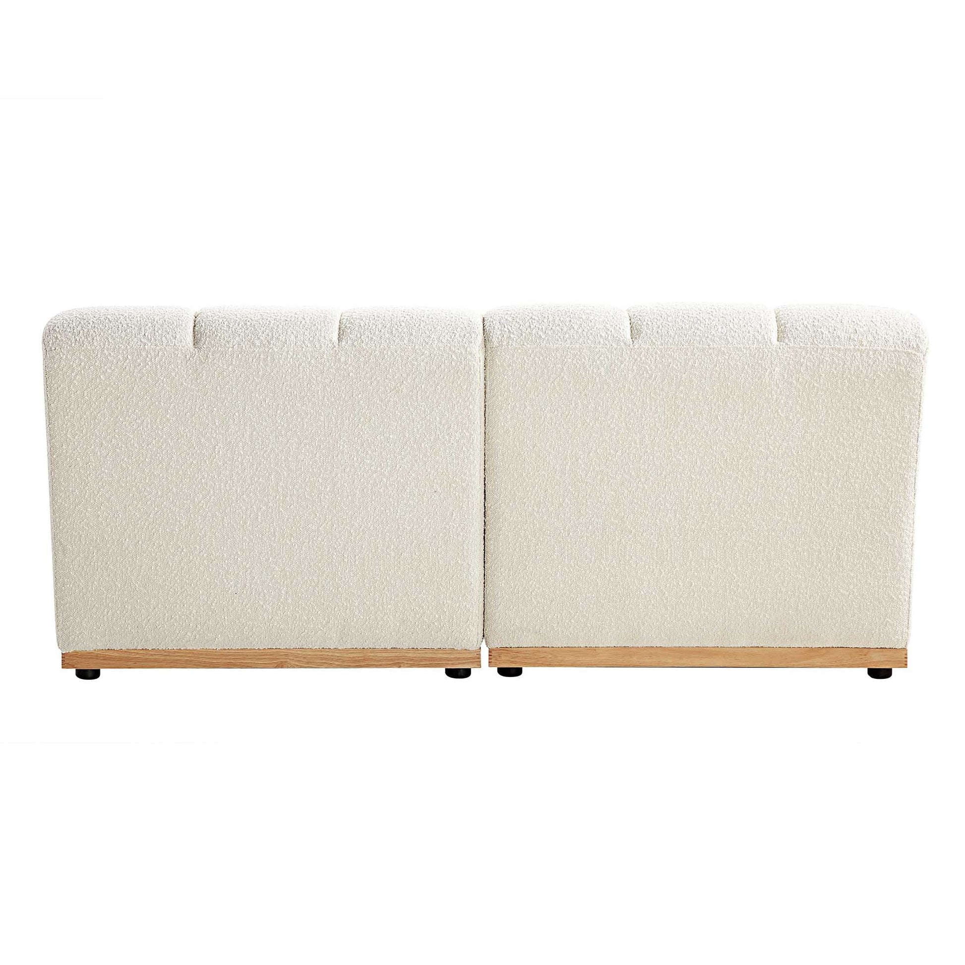 Recouvertes d'un magnifique tissu bouclé écru, les sections du canapé sont montées sur des bases en bois massif naturel.