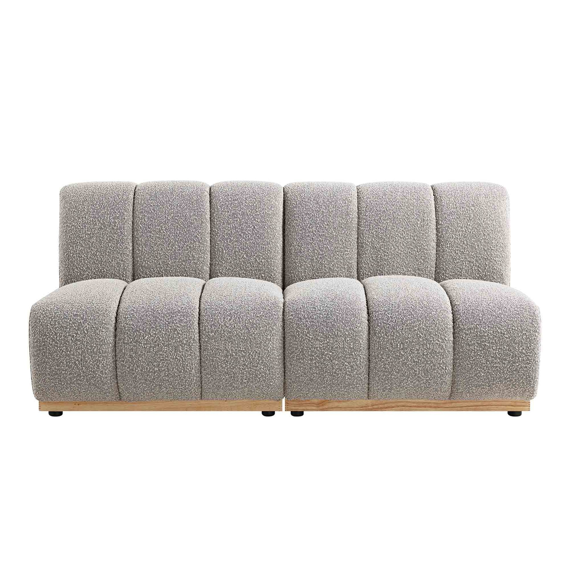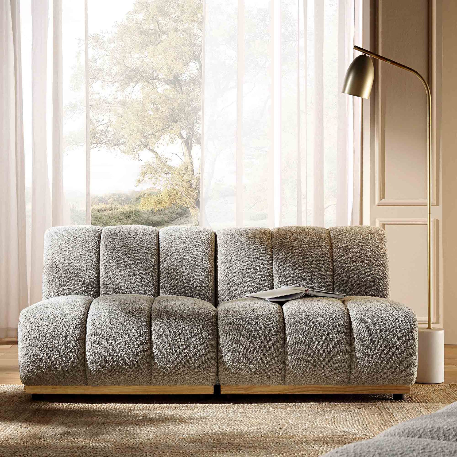 Recouvertes d'un magnifique tissu bouclé taupe, les sections du canapé sont montées sur des bases en bois massif naturel.